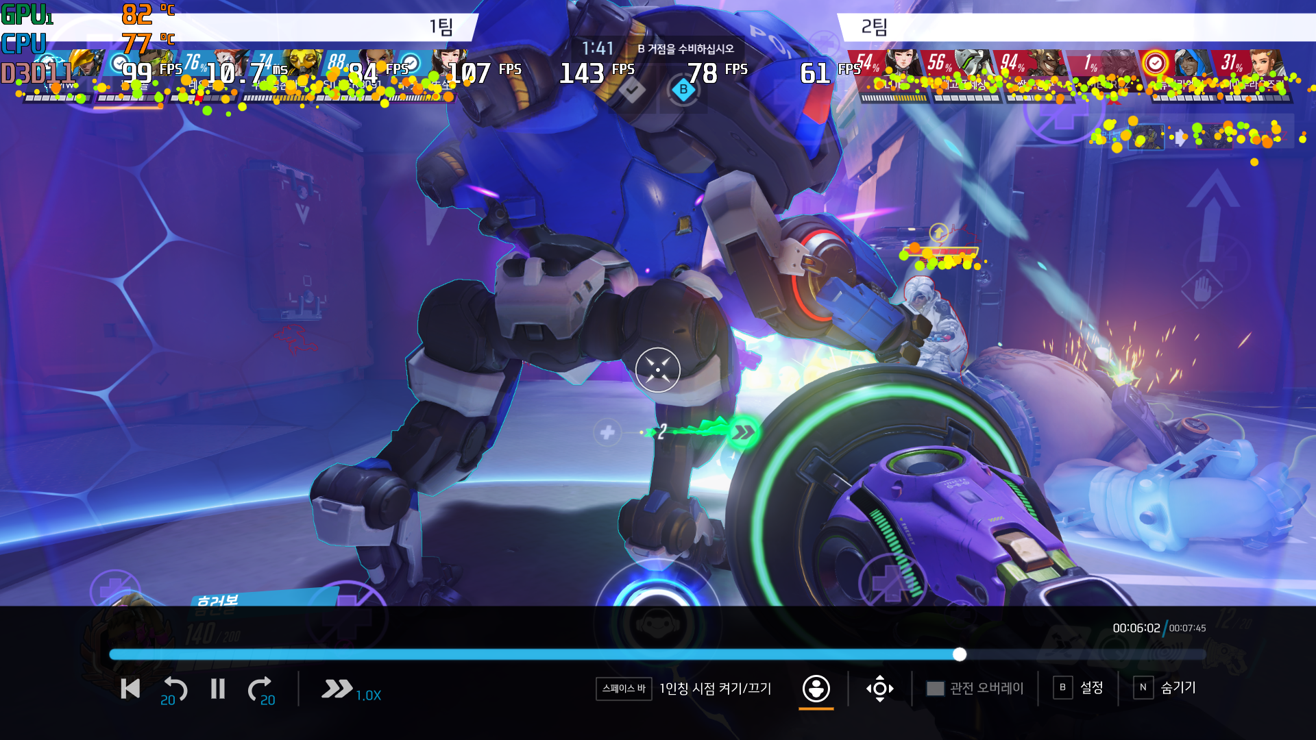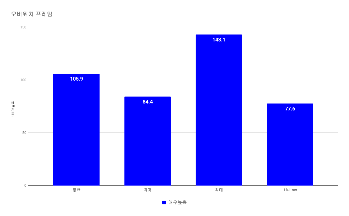 오버워치 매우높음 옵션에서는 평균 105프레임, 1% 로우 프레임이 77.6프레임으로서 배틀그라운드에 비해서 훨씬 높은 프레임이 나온다. 144Hz의 고주사율의 디스플레이 성능을 만끽할 수 있다.