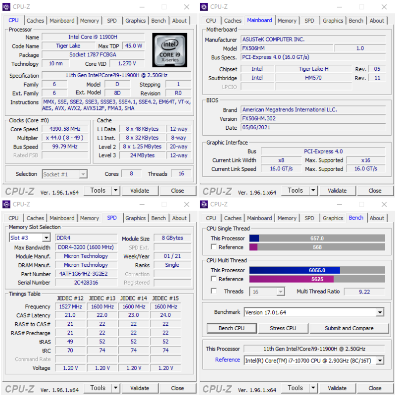 ASUS TUF Gaming F15는 8코어 16쓰레드 i9-11900H 프로세서 및 마이크론 DDR4-3200 메모리가 채택되었으며, CPU-Z 벤치마크 결과 데스크탑 i7-10700에 비해 월등히 뛰어난 성능을 보여준다.