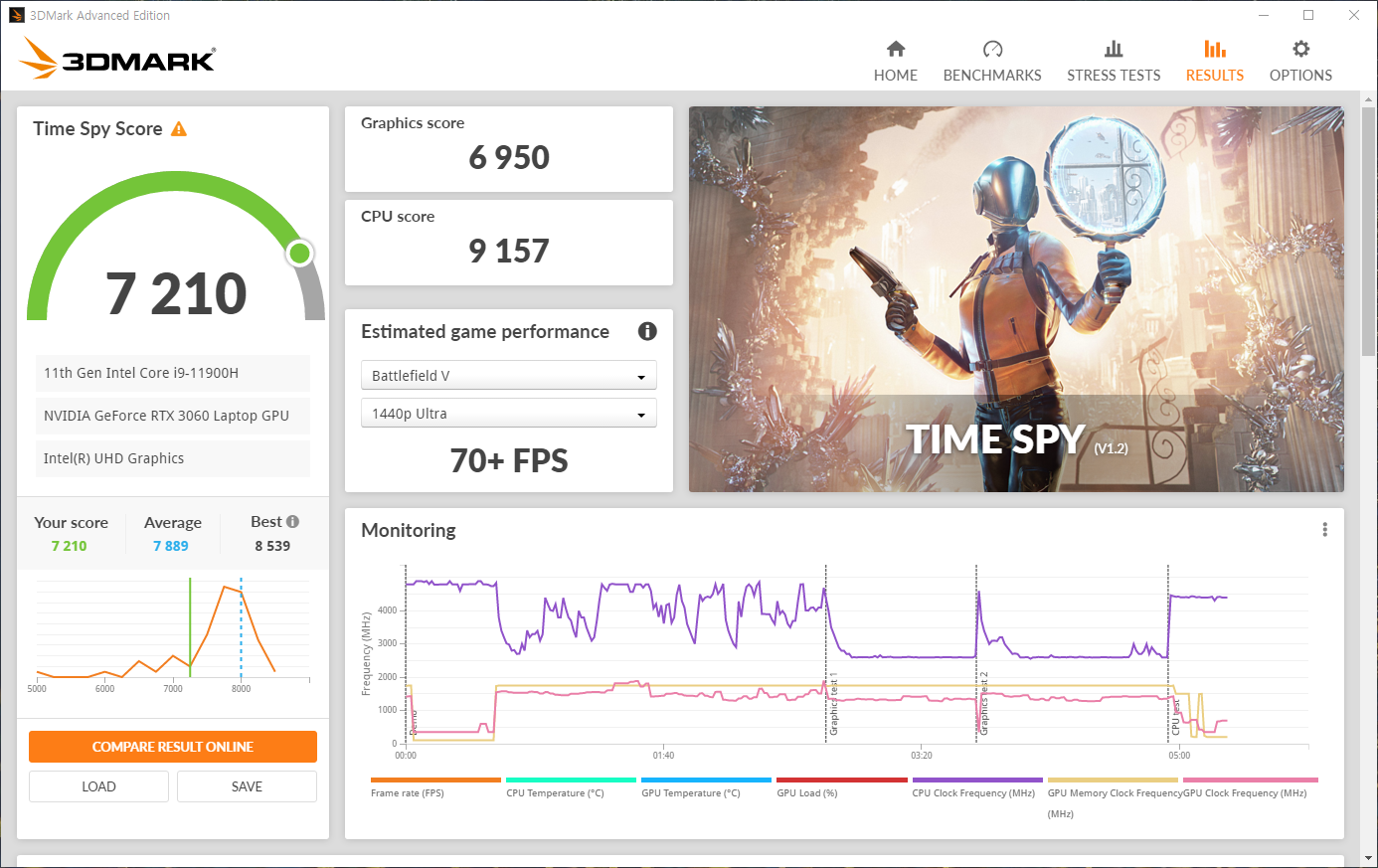 3D MARK 테스트 결과 파이어스트라이크는 16,091점 타임스파이는 7,210점이다. GPU가 Geforce RTX 3060으로서 3000 시리즈의 엔트리급이다보니 다소 낮은 점수를 보이지만 CPU점수만큼은 하이엔드급 답게굉장히 높다.