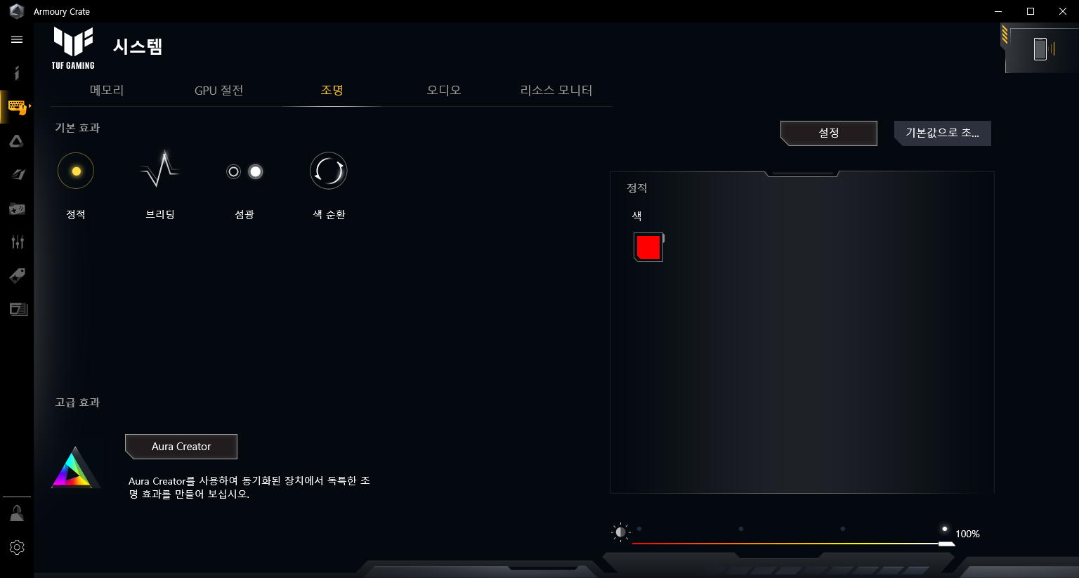 또한 게이밍 디바이스답게 RGB 백라이트가 적용되어 ASUS AURA RGB 제어 프로그램을 이용하여 RGB의 컬러 및 패턴 등을 다양하게 변화시킬 수 있어 나만의 색깔에 맞는 유저커스터마이징이 가능하다.