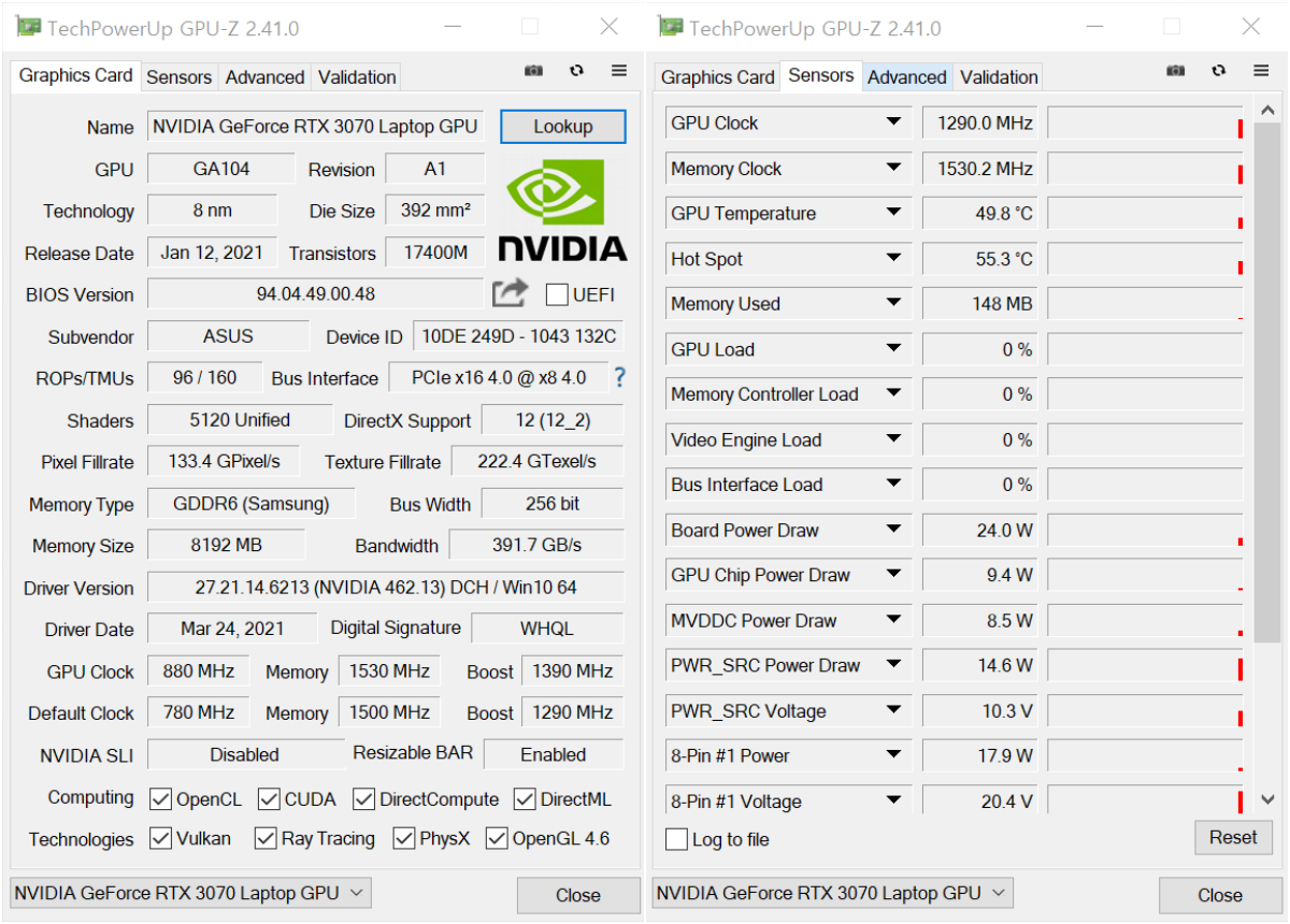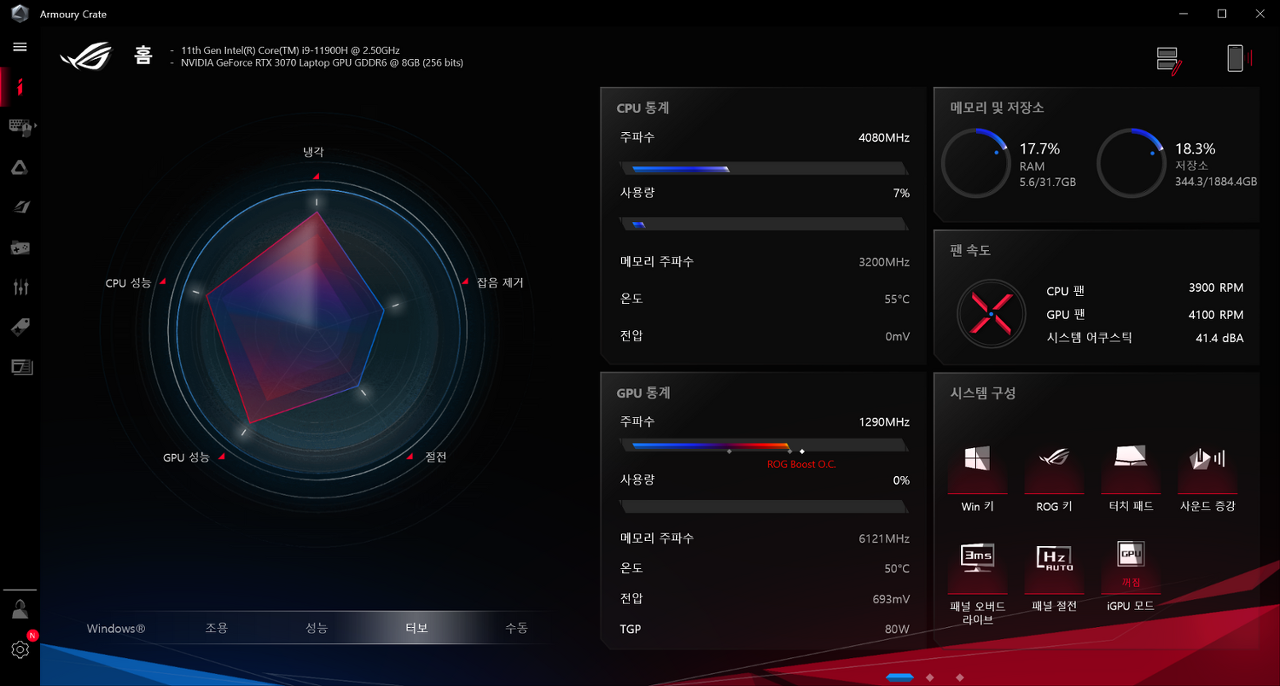 기본 설정(Armoury Crate 에서 성능 모드 기준)에서 CPU는 48배수, 메모리 대역폭은 3,200 Mhz 으로 작동하고 있으며, 그래픽칩셋은Nvidia RTX 3070 랩탑버전(PCIe 4.0 GDDR6 8Mb)이 탑재된 것을 확인할 수 있다.