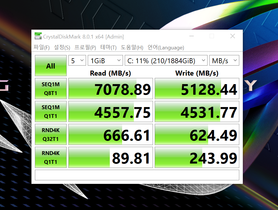 특히 읽기 속도는 7,000Mb/s 에 달하고 쓰기 속도 또한 5,128Mb/s 로서 Nvme 타입 SSD에서는 상당히 발군의 능력을 보여주고 있다.