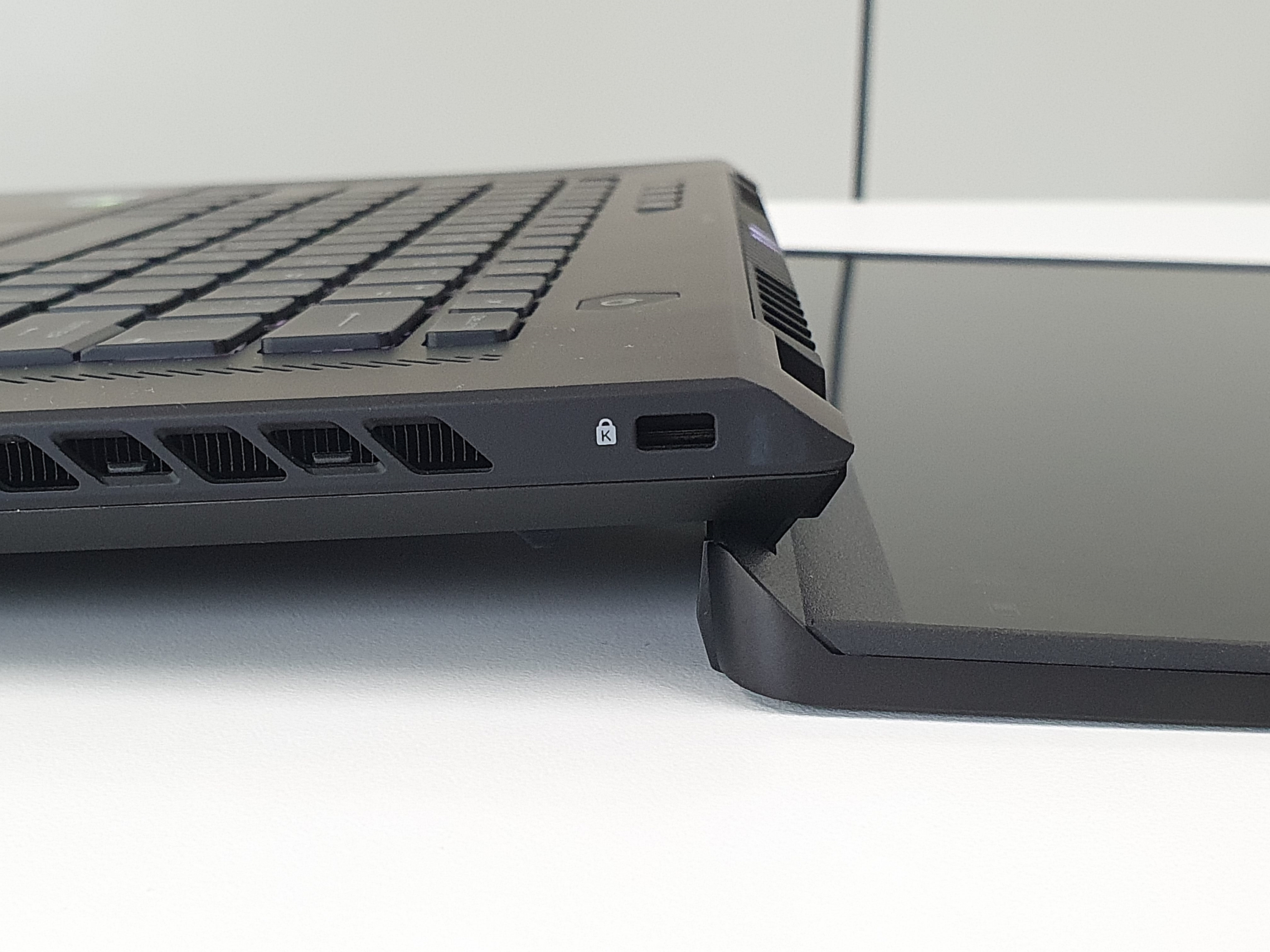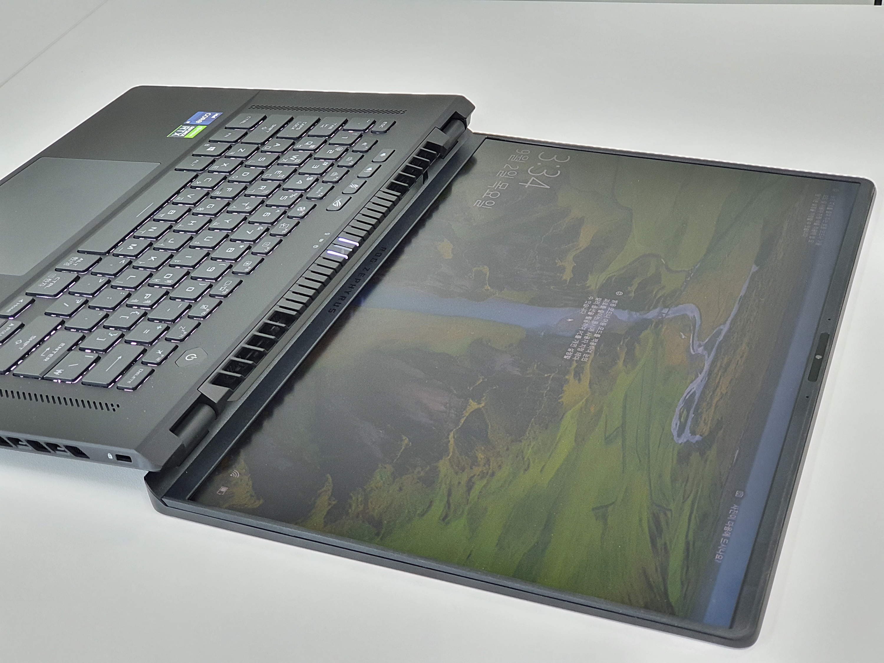 ASUS ROG 제피러스 M16의 또 하나의 특징은 에고리프트 힌지가 채택되어 화면을 180도까지 젖힐 수 있어서 다양한 환경에서도 활용도가 높다. 특히 여러 사람들과 디스플레이 화면을 공유할 때 반대편에 앉은 사람들까지 시야가 확보되기 때문에 참 편리하다.