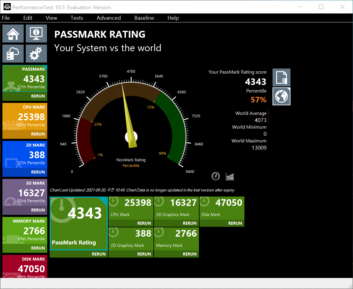 패스마크 점수는 4, 343점이며 CPU부터 그래픽, 메모리, 디스크까지 전반적으로 높은 수치를 보여준다.