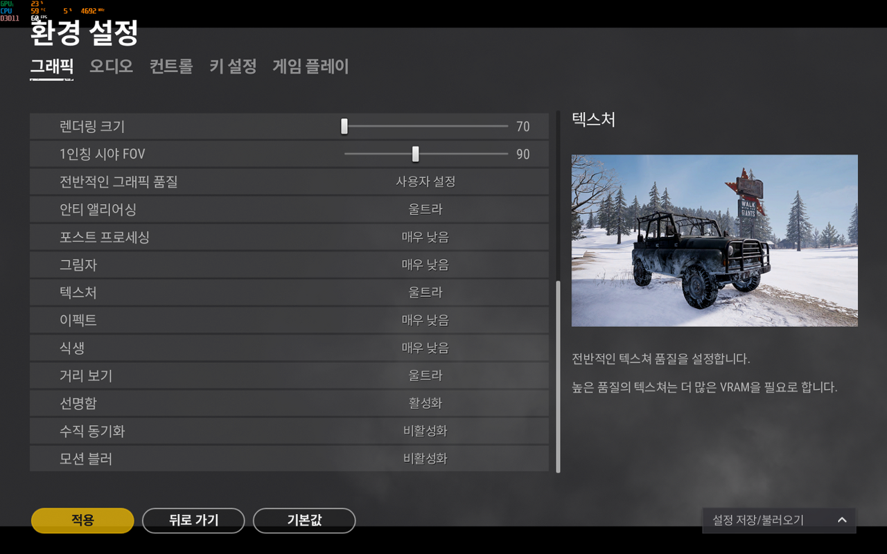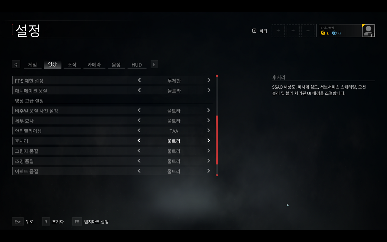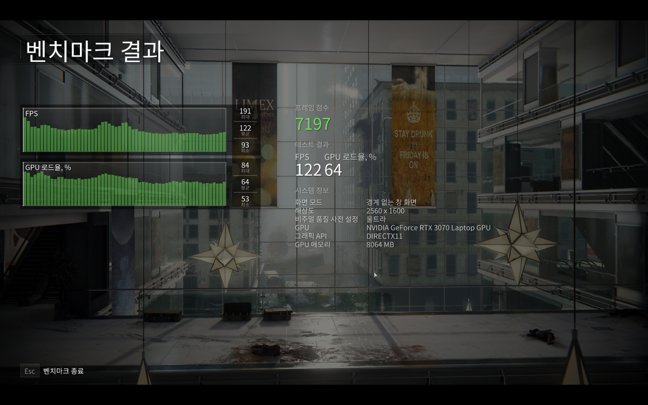 전반적으로 인텔 i9-11900와 NVIDIA RTX 3070 을 탑재하여 2560X1600 해상도에서 대체적으로 상급 옵션기준으로 전반적으로 모든 게임을 쾌적하게 플레이할 수 있었다.