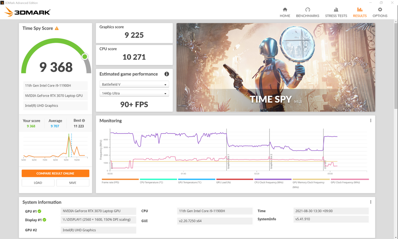 3D MARK 벤치결과 파이어스트라이크 21,250점, 타임스파이는 9,368점으로서 게이밍 노트북으로서의 진가를 여실히 보여준다.