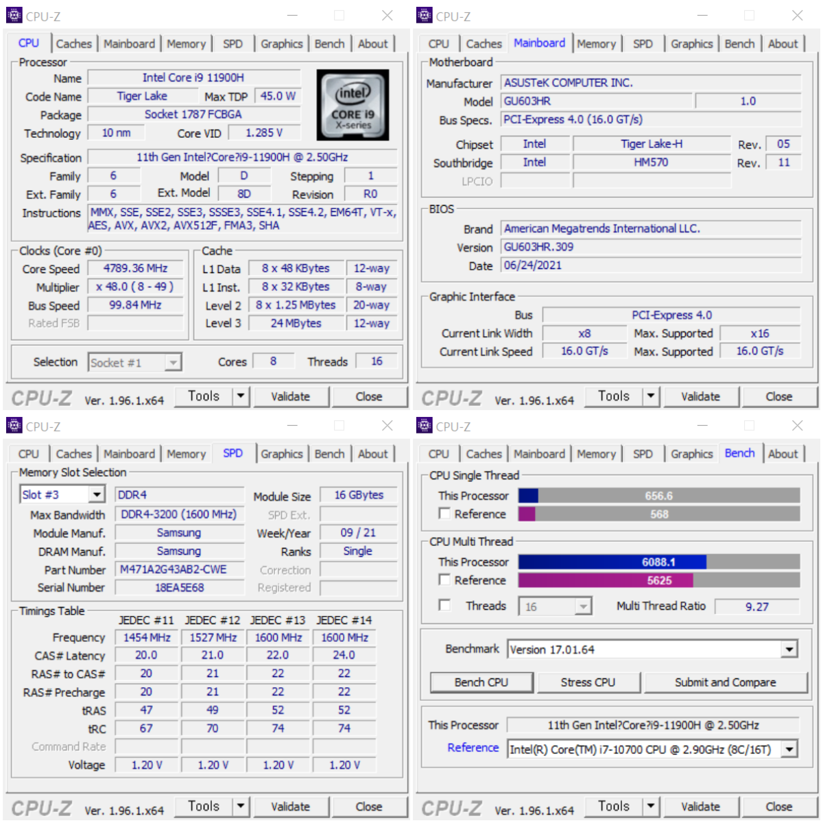 CPU-Z 벤치결과 싱글 쓰레드 점수는 656점, 멀티 쓰레드는 6,088점을 기록하였다.