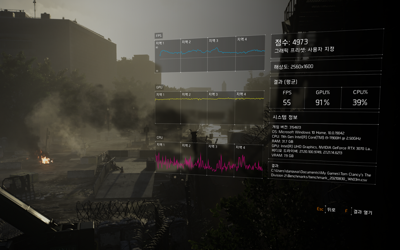 디비전2는 매우높음 옵션기준 4,973점으로서 QHD 해상도에 비해서 더 높은 WQXGA 해상도에서도 평균 55프레임을 기록하였다.