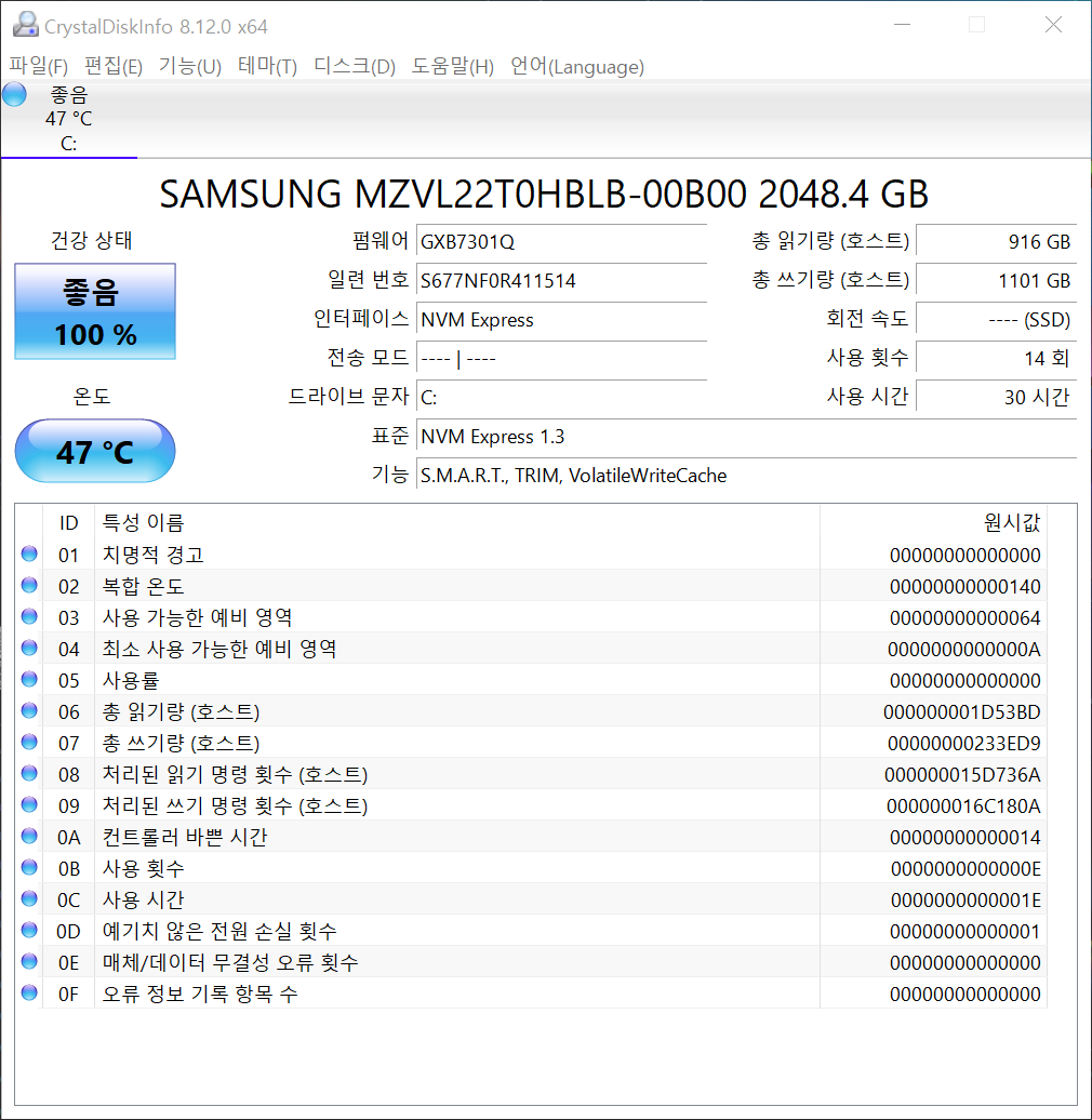저장장치는 삼성 Nvme 타입의 고성능 SSD (모델명 : MZVL22T0HBLB)가 탑재되어 우수한 읽기/쓰기 능력을 보여준다.