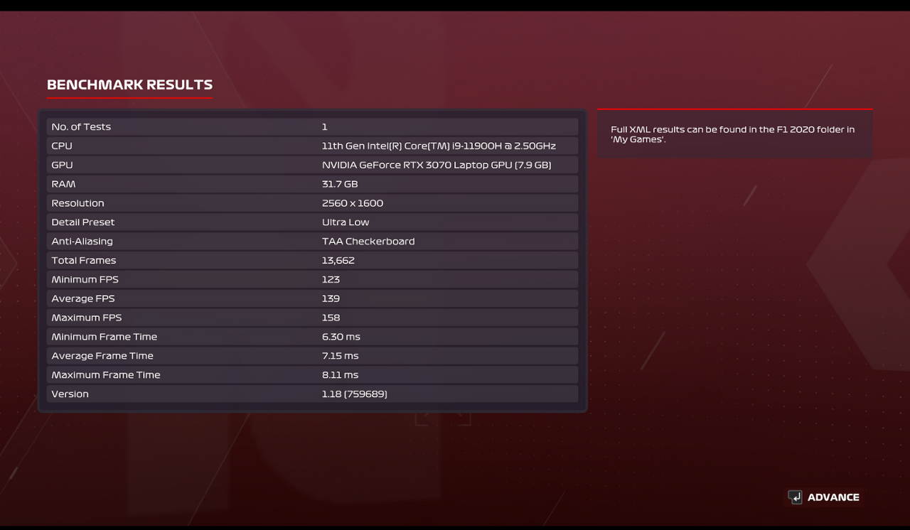이번에는 레이싱 시뮬레이터로 인기있는 F1 2021에서 측정결과 최소 프레임은 123, 평균 139프레임을 기록하였다.