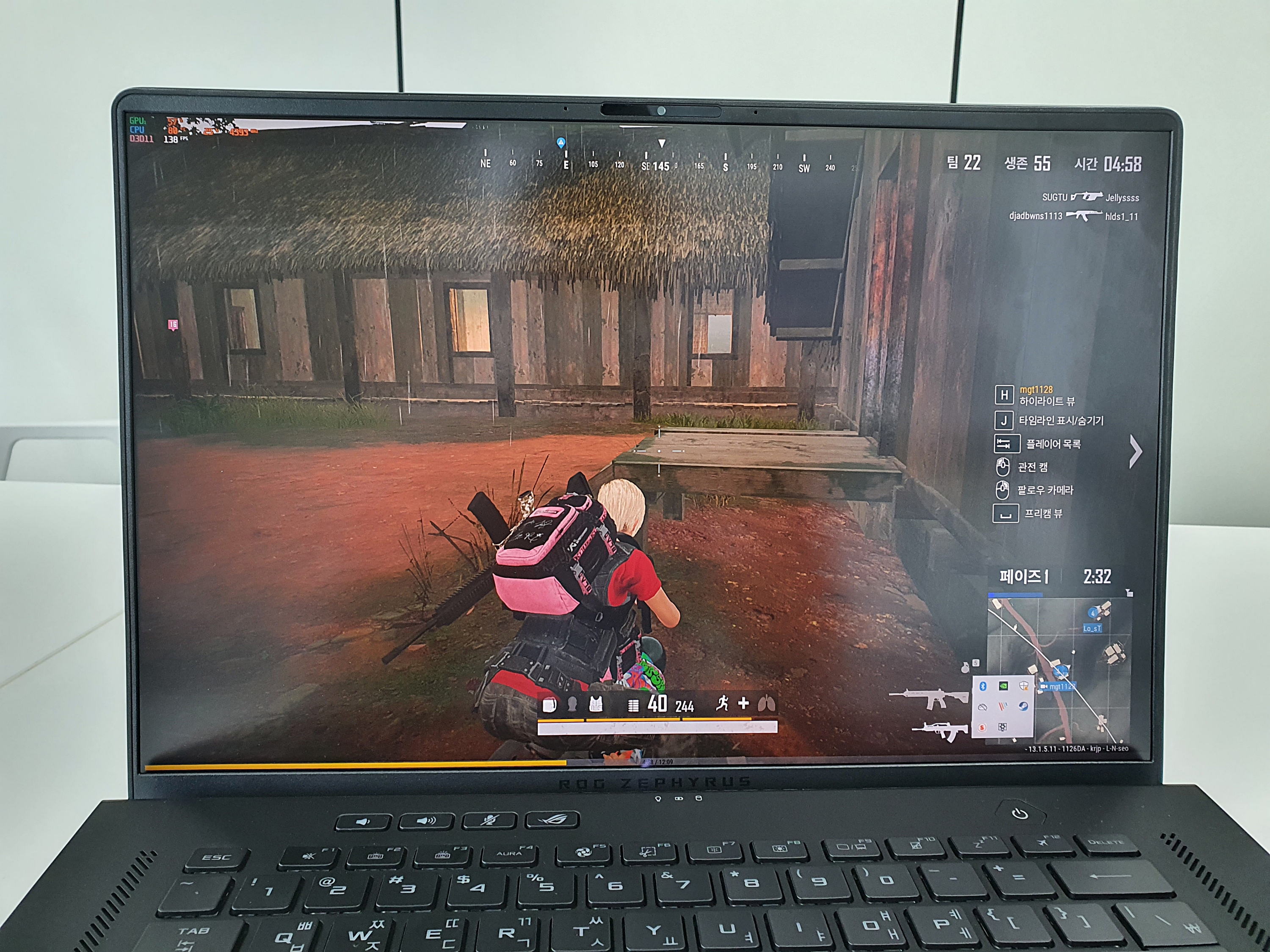 배틀그라운드는 국민옵션에서 약 121프레임으로서, 인텔 i9-11900H 프로세서와 RTX 3070 조합의 고성능을 그대로 보여준다. 평균 프레임이 165Hz의 주사율을 그대로 즐길 수 있다.
