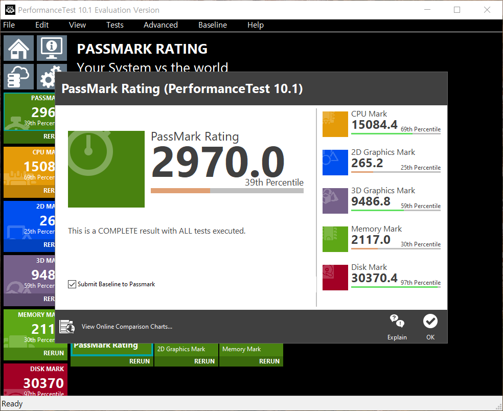 Passmark사의 Performance Test에서는 2970점으로 약 39% 정도의 수준에 레이팅 되었다.