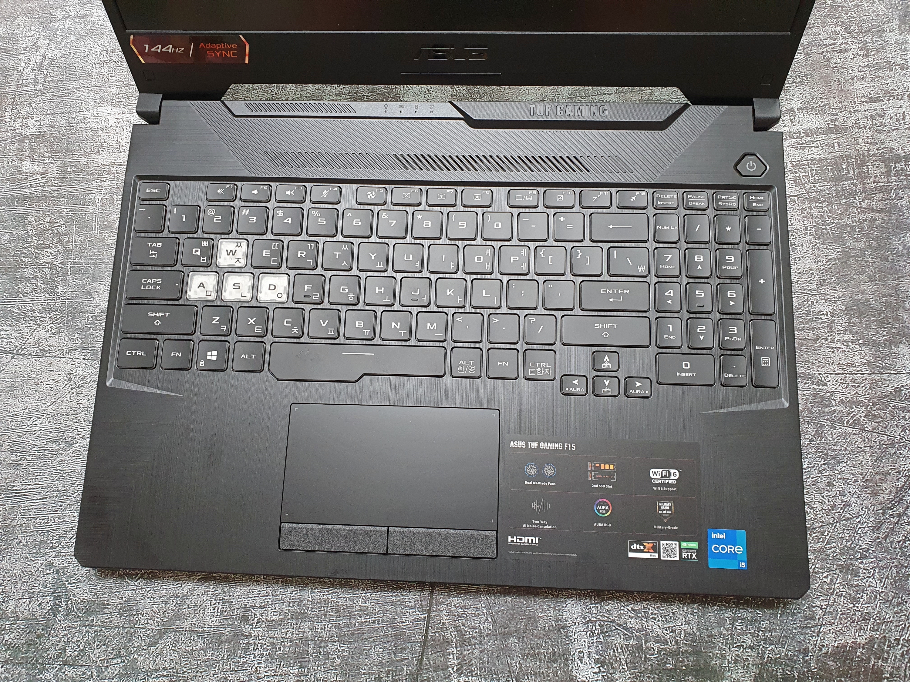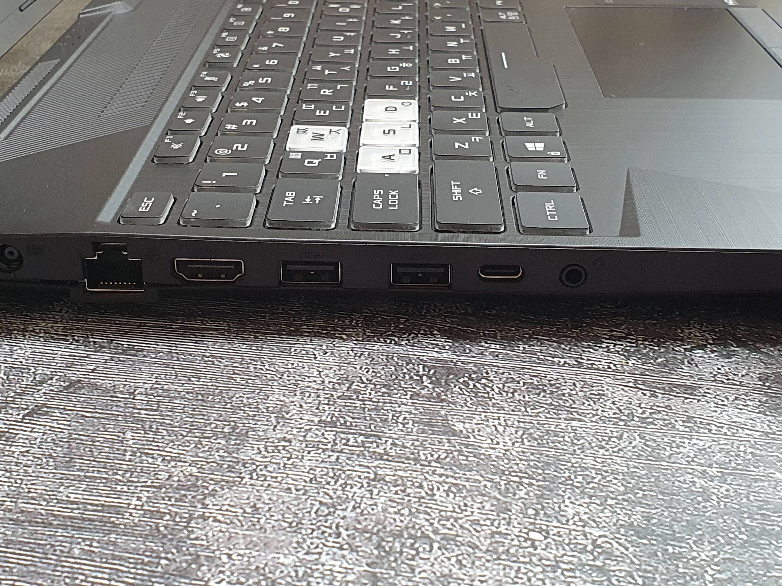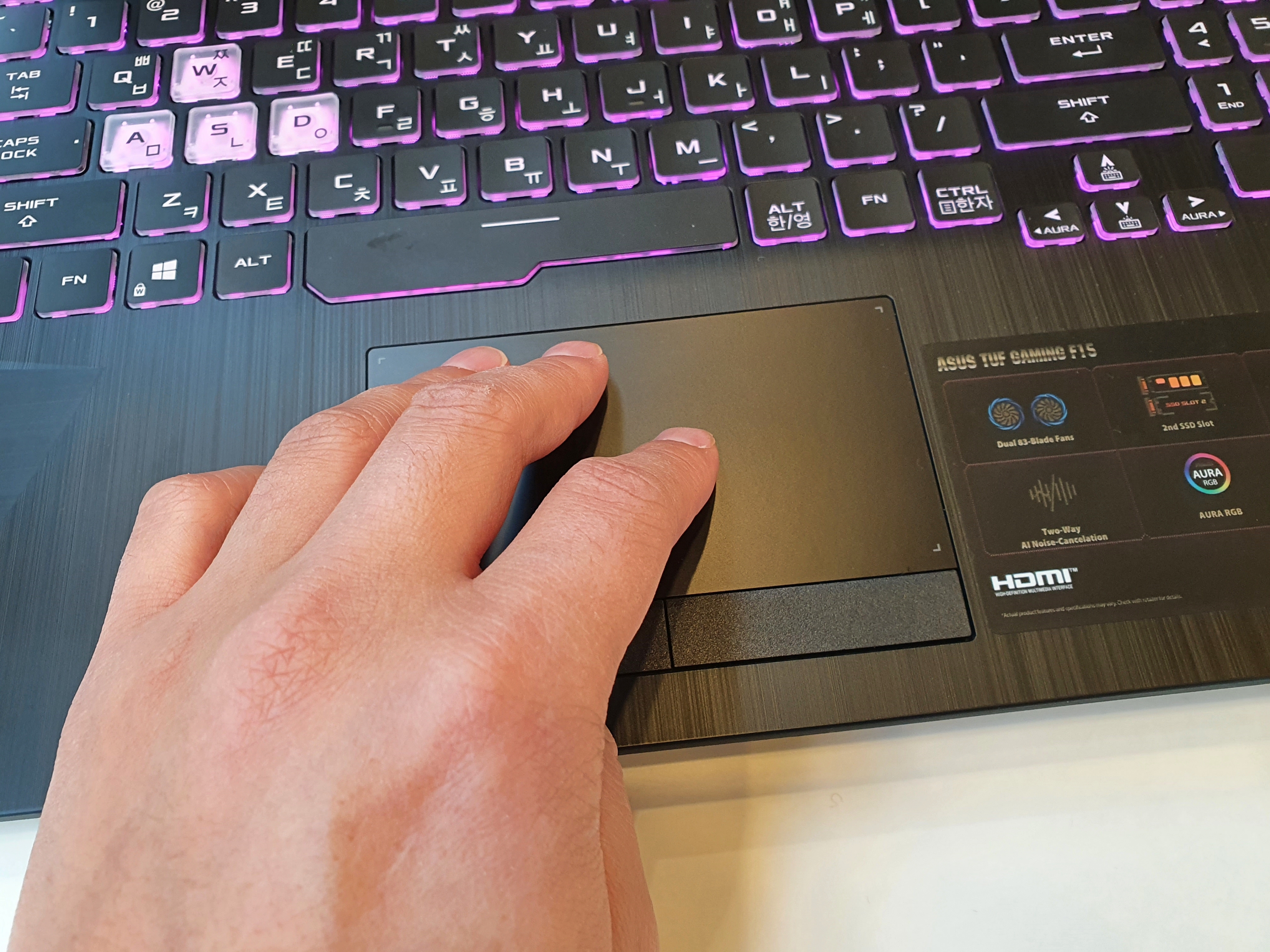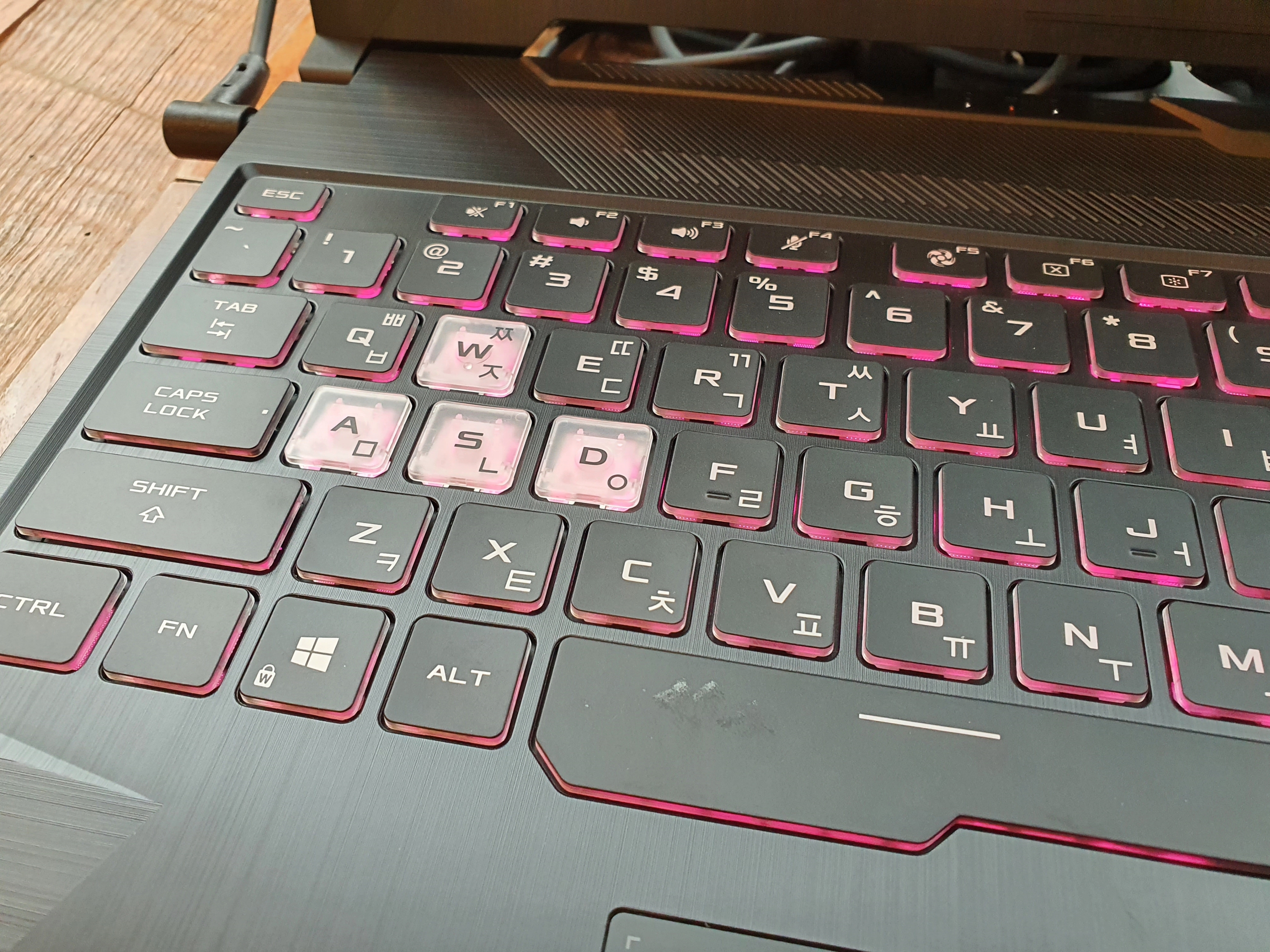 게이밍 노트북 답게 게임에서 자주 사용하는 WASD 키는 별도로 투명한 아크릴 형태의 키캡을 취하고 있어 가시성이 좋다.