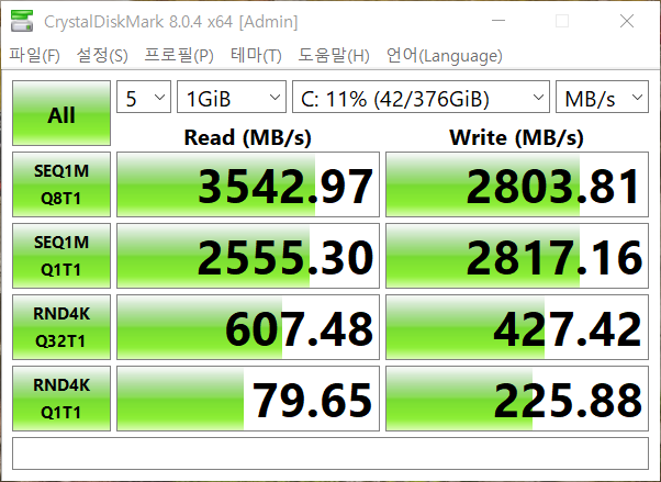 고성능 NVMe SSD가 탑재된 만큼일반 SSD대비 약 5~6배 정도 빠른 속도를 보여주며 연속읽기 3,542Mb/s, 쓰기 속도 2,803Mb/s로 우수하다. 특히 로딩과 화면 전환이 빈번하게 발생하는 게임에서 뿐만 아니라 대용량의 파일들을 편집하는 영상 편집 등의 컨텐츠 제작 작업에도 충분한 성능이다.