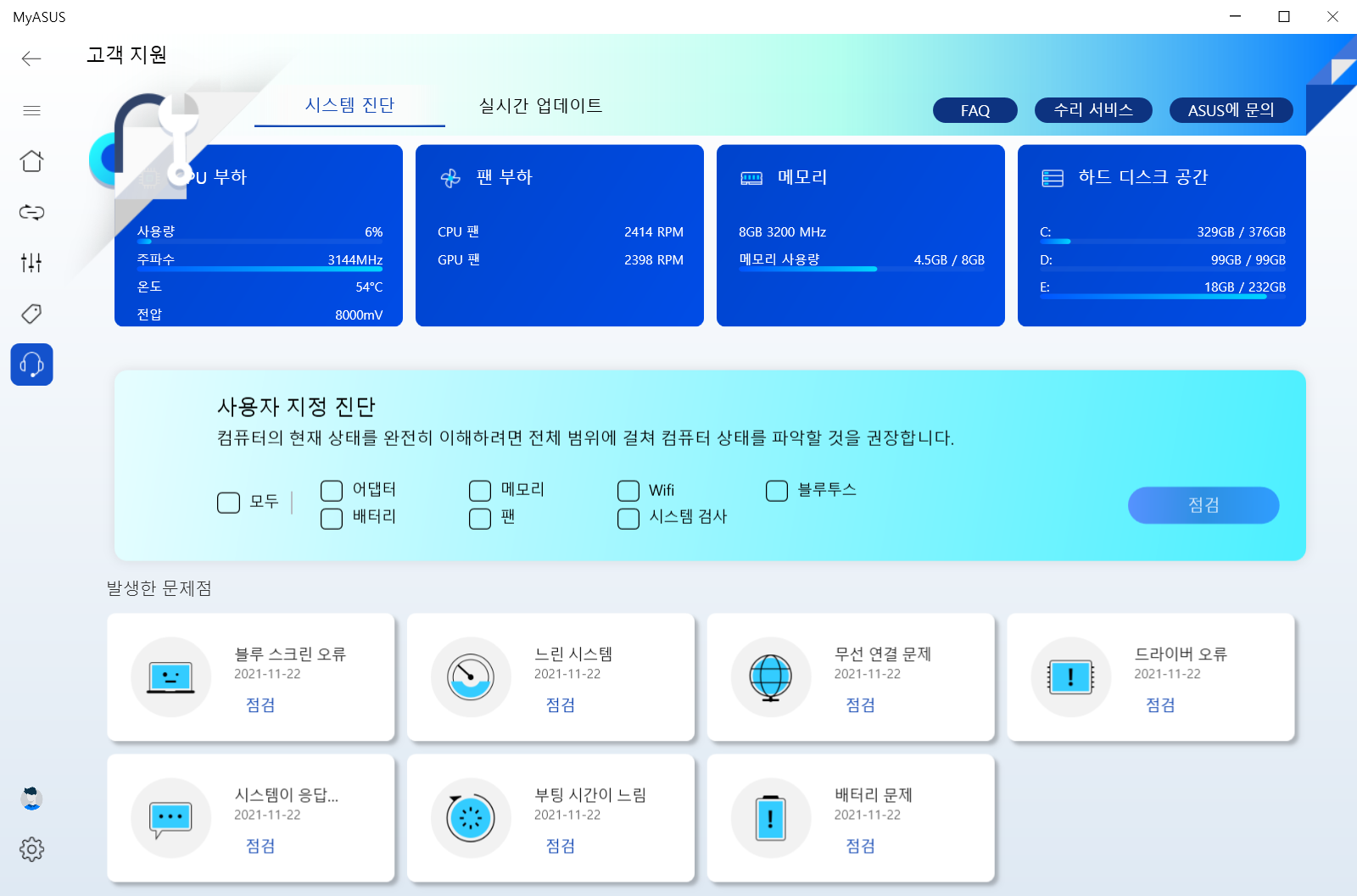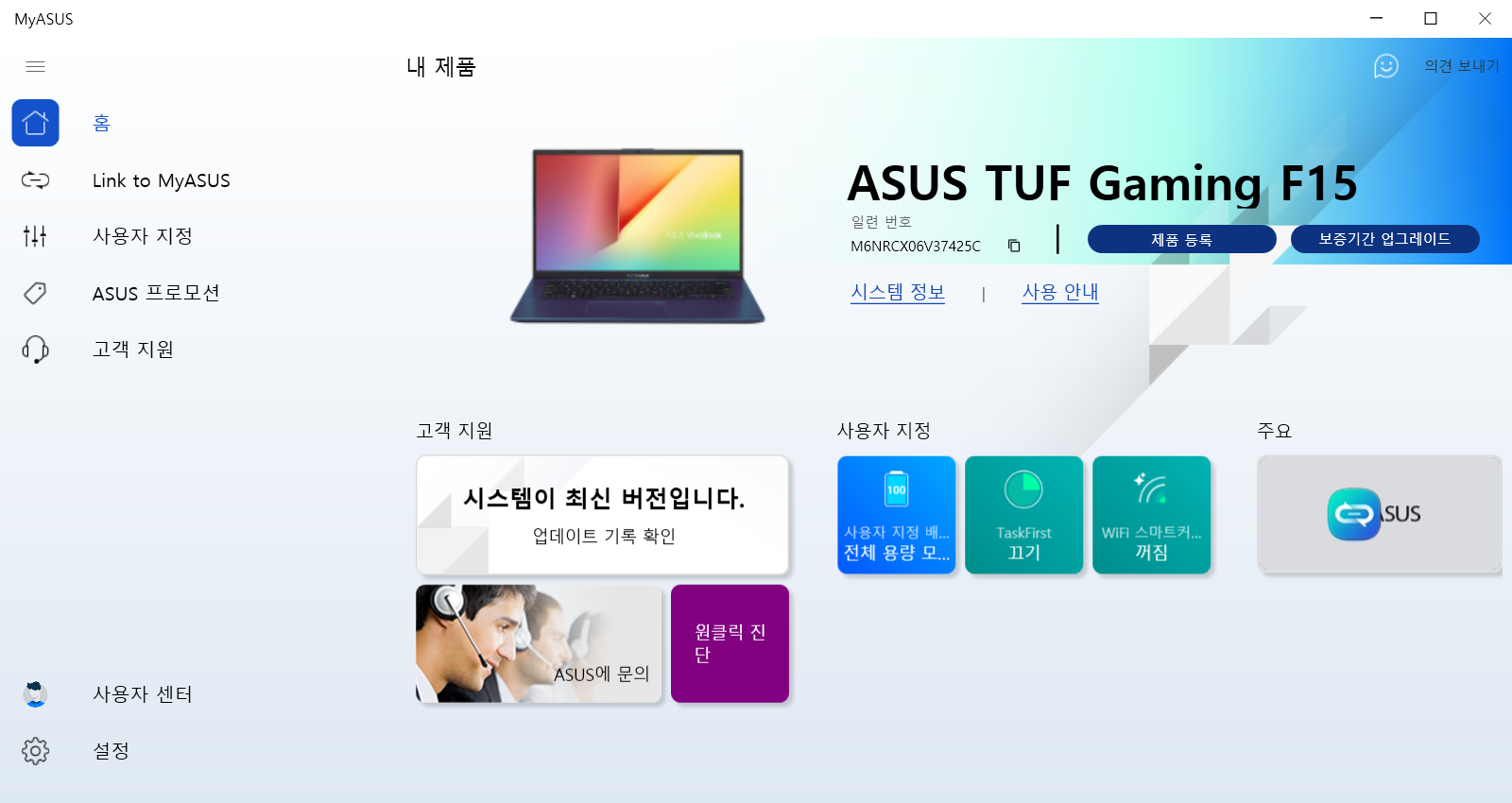 대기업 제품답게 MyAsus라는 유지관리SW가 제공이 되어서 드라이버 맟 펌웨어 업데이트와 최적화 기능을 원클릭으로 쉽게 관리할 수 있다.