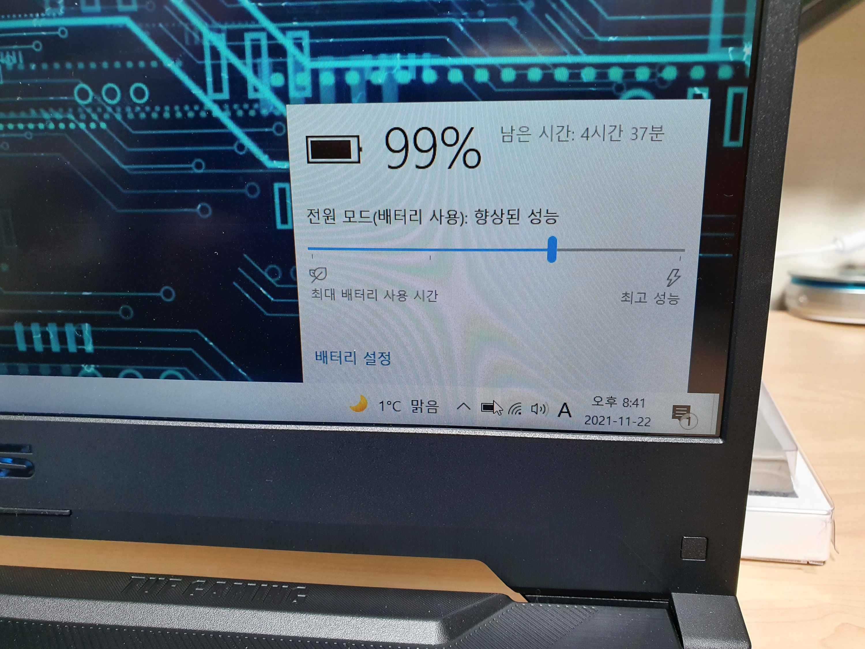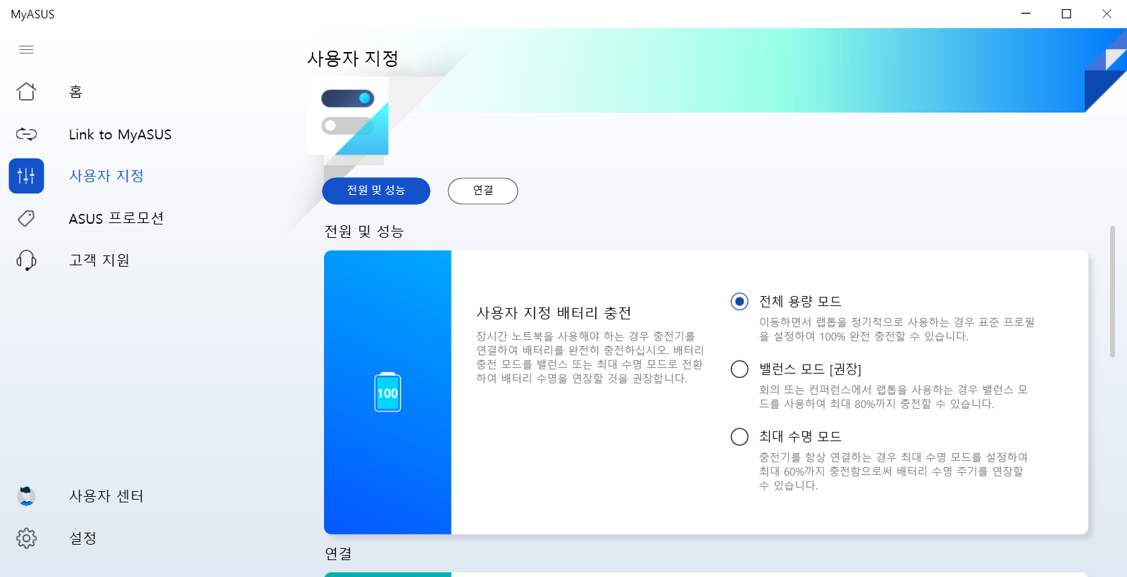 노트북의 휴대성에 있어 가장 중요한 요소인 배터리 모드도 다양하게 지원되고 있어 배터리 사용시간을 최적화하는 기능이 추가되어 있다.