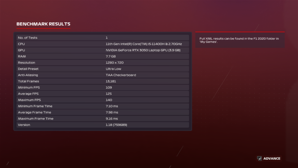 먼저 레이싱 게임인 F1 2020에서는 울트라 로우 옵션에서 평균 125프레임, 최소 109프레임으로서 게임을 무난하게 즐길 수 있다.