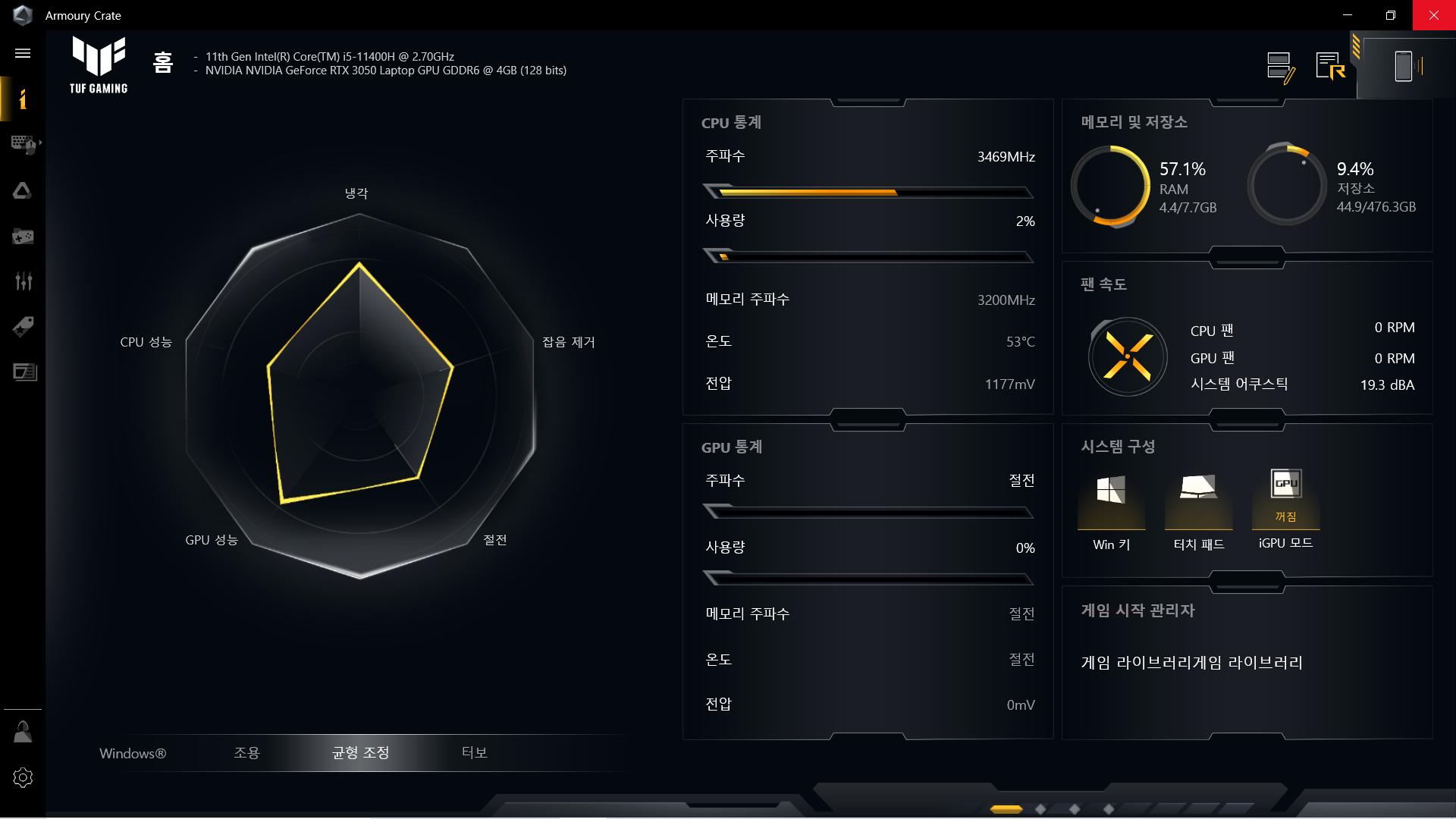 보다 전문적으로 시스템 튜닝과 최적화를 위해서는 ARMOURY CRATE 프로그램을 이용하면 보다 세부적인 설정이 가능하다. 여기에서는 CPU 및 GPU, 메모리 클럭, 팬속도, 램 사용량 등의 정보를 확인할 수 있으며 ASUS AURA ARGB 설정이 가능하다.