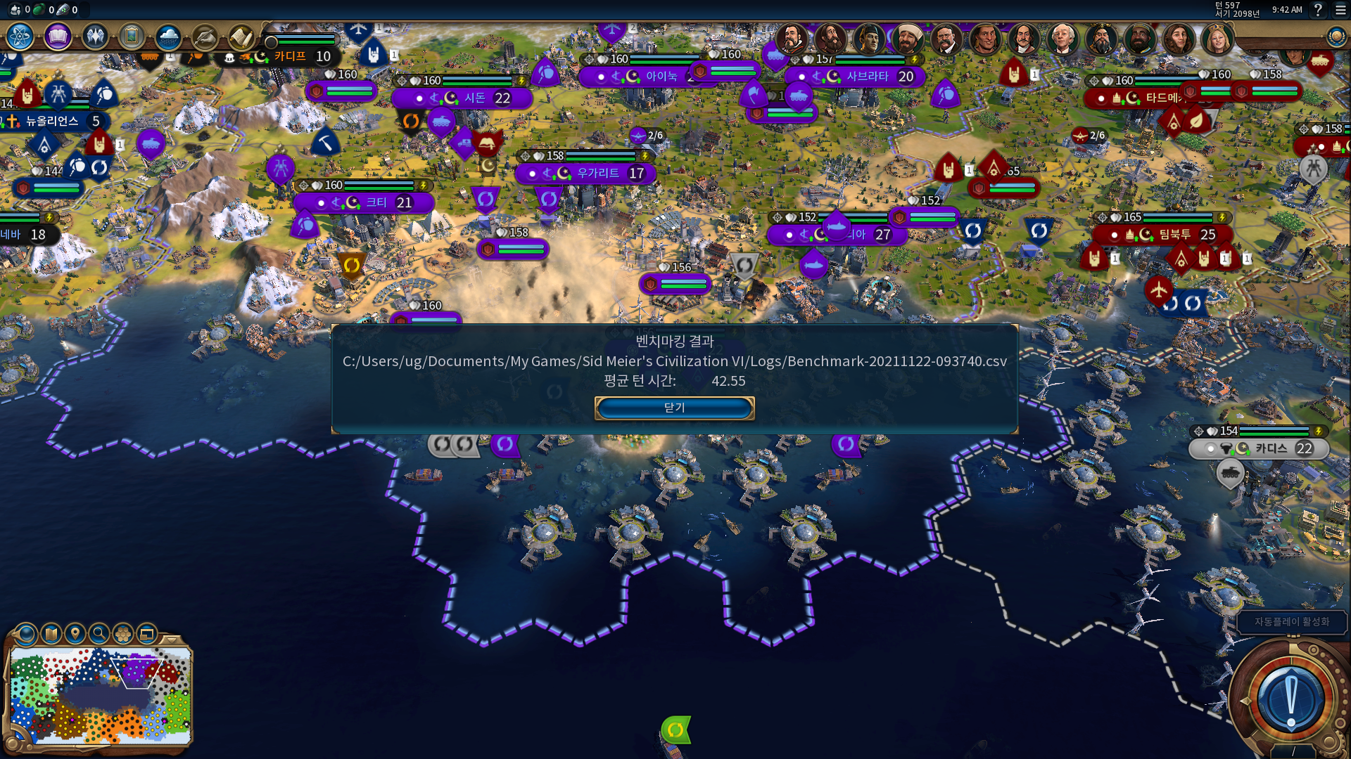 비교적 오랜시간이 지난 게임인 문명6 "몰려드는 폭풍 AI"의 평균 턴 시간은 42.55초를 기록하였으며 적당한 성능을 보여준다.