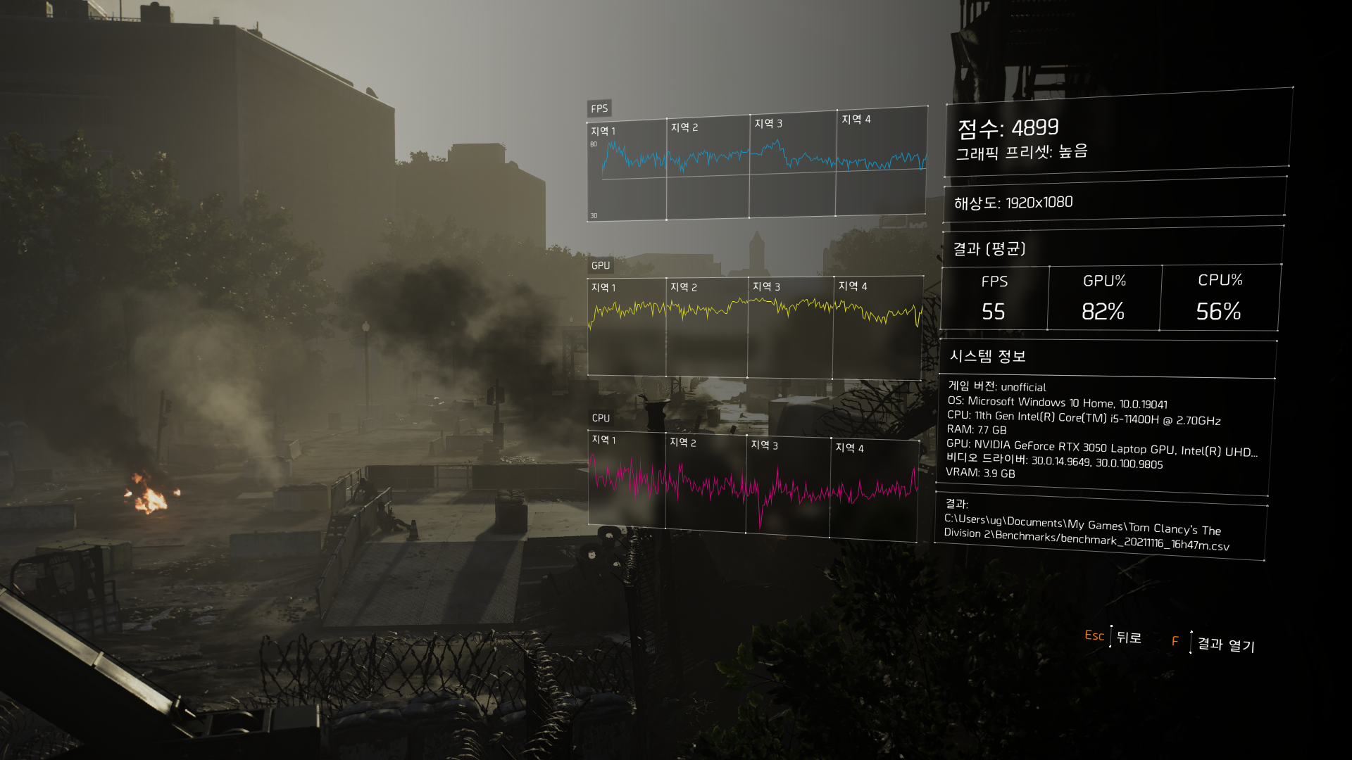 디비전2 높음 옵션에서 평균 55프레임을 기록하였다. 비교적 프레임이 잘 안나오는 것을 고려했을 때는 수긍할 수 있는 정도이다.