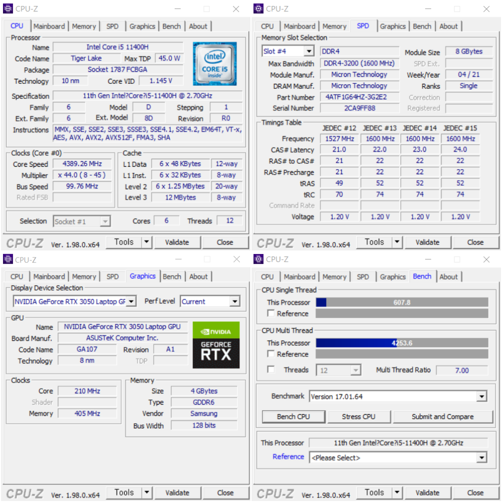 먼저 CPU-Z를 통해서 기본 스펙과 벤치마킹 테스트를 해 보았다. CPU는인텔 i5-11400H는 6코어 12쓰레드로 최대 2.7Ghz 클럭으로 작동하며, 메모리는 DDR4 3200Mhz로 세팅되었음을 확인할 수 있다. 또한 인텔 내장그래픽 외에 RTX 3050 GPU 칩셋이 탑재된 것을 확인할 수 있다.