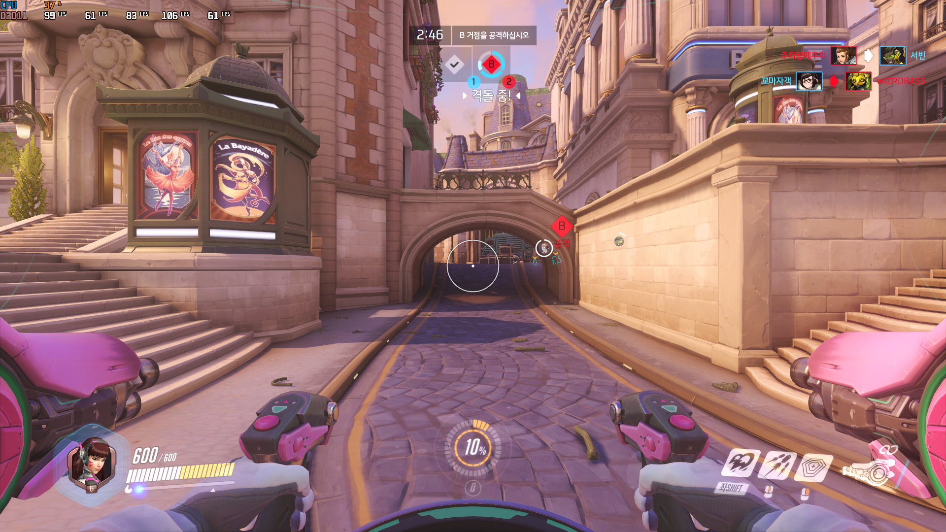 오버워치는 높음 옵션으로 했을 때 평균 83.7프레임, 최소 프레임은 60.6 프레임, 1% low 프레임은 61프레임으로 배틀그라운드와 평균 프레임은 비슷하지만 최소 프레임에서는 높게 나왔다.