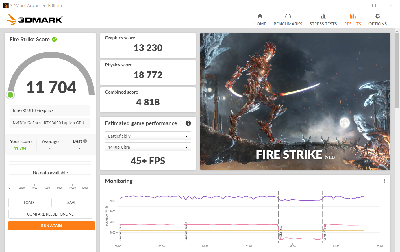 3D MARK 테스트에서 파이어스트라이크는 11,704점, 타임스파이는 4,916점을 기록하였다.