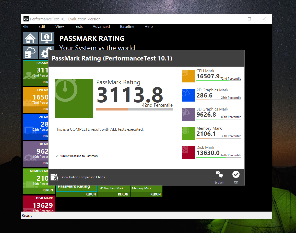 PASSMARK 사의 Performance Test는 약 3,113점으로 42% 수준으로서 중급이상의 성능을 확인할 수 있다.
