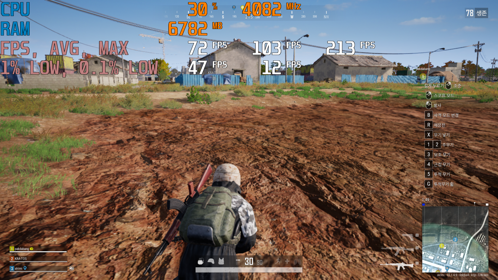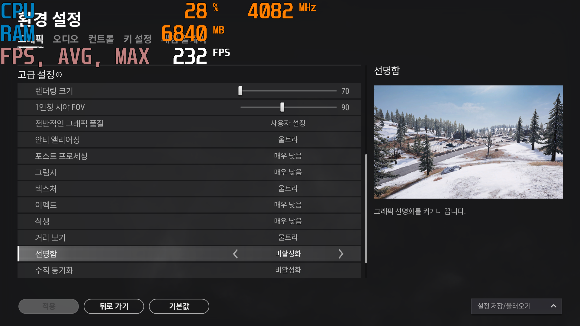 다음은, 배틀그라운드 국민옵션과 렌더링 크기 70기준으로 프레임 테스트를 해 보았다.