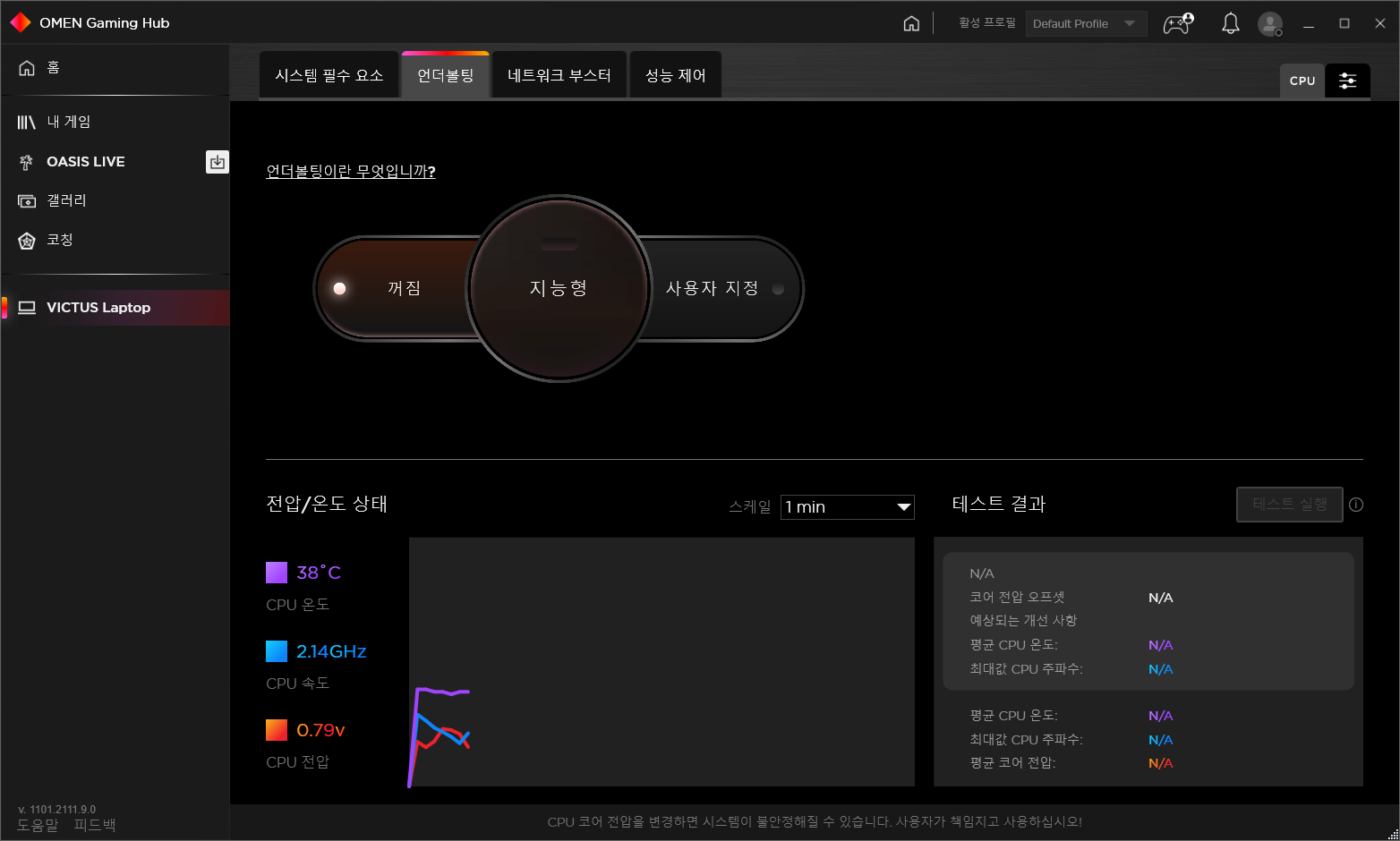 그리고 하이엔드 라인인 OMEN 노트북 라인의 OMEN Gagming Hub 프로그램과 호환이 되기 때문에 게이밍 성능을 더욱 끌어올릴 수 있다. 여기서는 전압과 온도 팬모드 등을 조절할 수 있으며 언더볼팅을 통해서 더욱 성능을 극대화시킬 수 있는점 또한 눈여겨 보아야 할 부분이다.