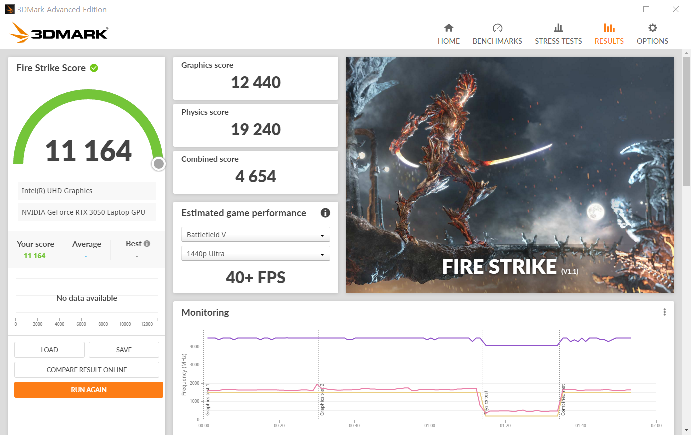 3D MARK 테스트에서는 총 11,164점을 기록하였으며 CPU 및 GPU 모두 클럭저하 없이 제 성능을 내어준다.