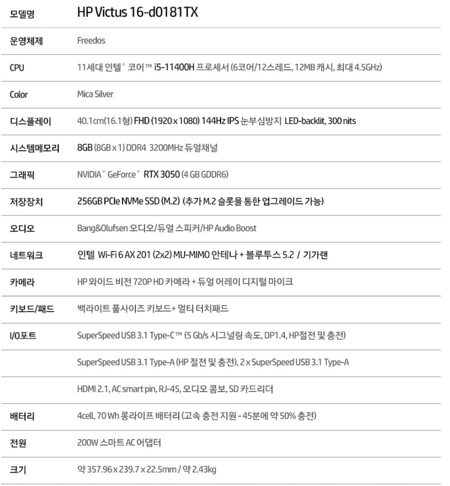 HP Victus 16-d0181TX (SSD 256GB)는 최신 인텔 11세대 i5-11400H(4.5Ghz) 프로세서와 NVIDIA GeForce RTX 3050 그래픽 칩셋, DDR4-3200Mhz 8gb램, NVMe SSD 256Gb를 탑재하였다.