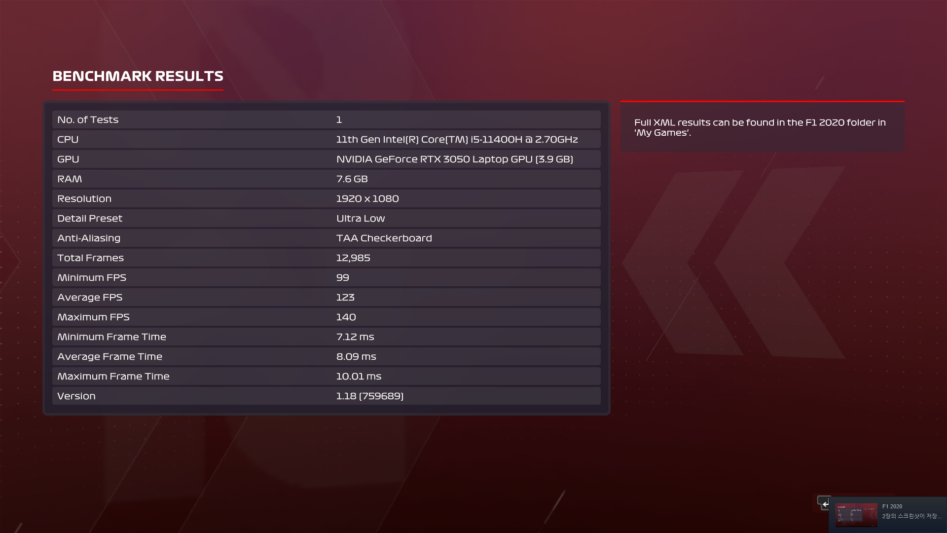 이제 본격적으로 게이밍 성능 테스트 결과를 살펴보자. 먼저 F1 2020 레이싱에서는 Ultra Low 옵션으로 평균 123프레임, 최저 99 프레임을 기록하여 빠른 장면의 전환이 주가되는 레이싱 게임을 즐기는데도 크게 무리가 없는 것을 확인할 수 있다.
