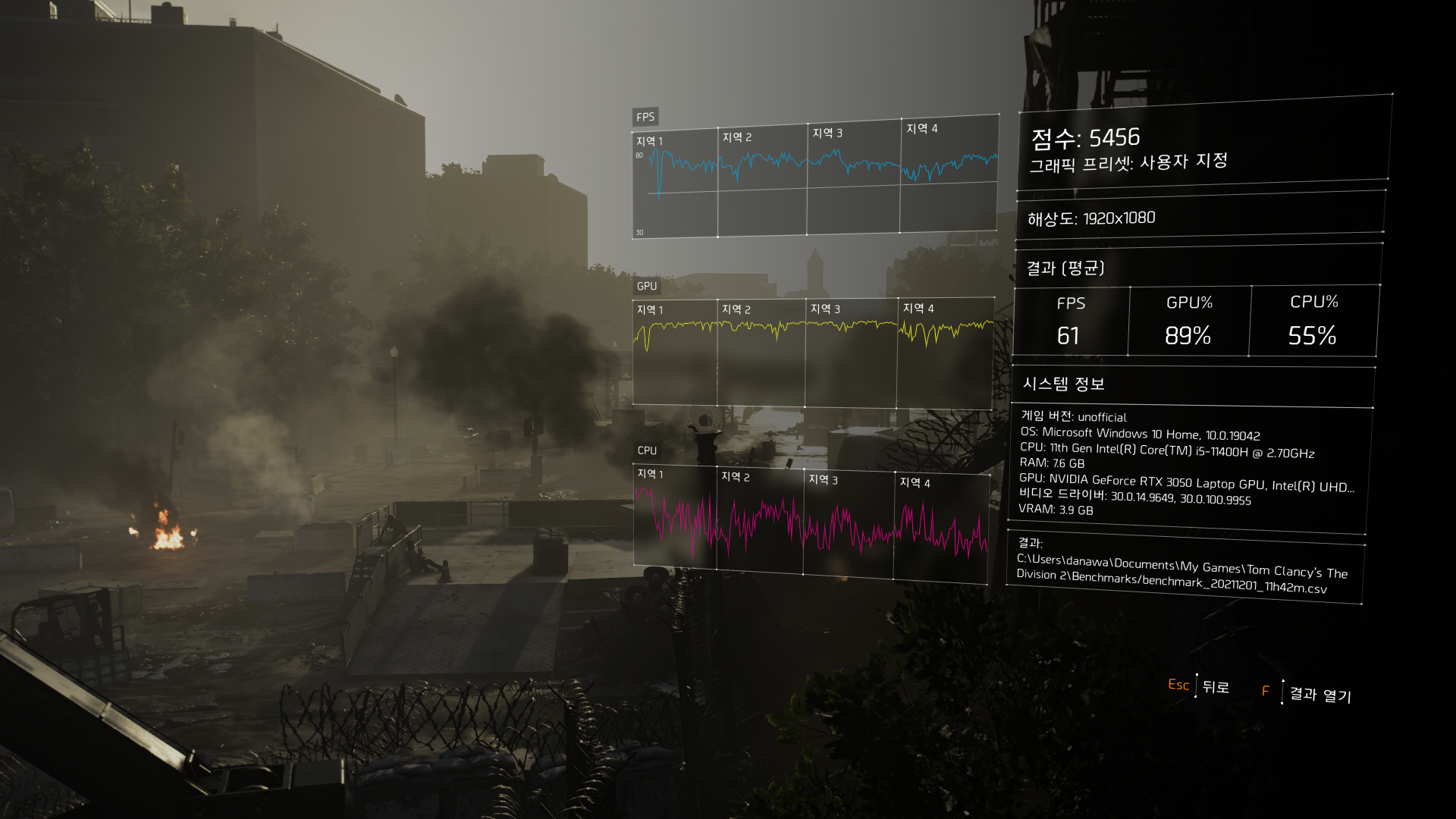 다소 고사양을 요구하는 디비전2는 평균 61프레임을 기록하였으며 여기서도 옵션을 조금 조정한다면 무난한 플레이가 가능하다.