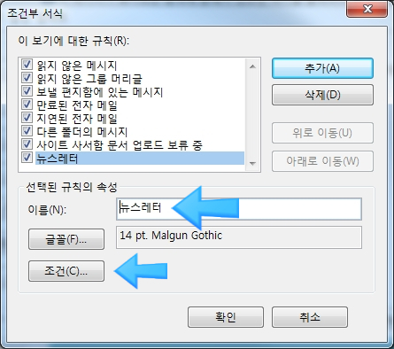 3. 조건부 서식에서 "추가" 버튼을 누른 후 "이름" 항목에 적당한 이름을 넣어줍니다. 그리고 조건을 누릅니다.