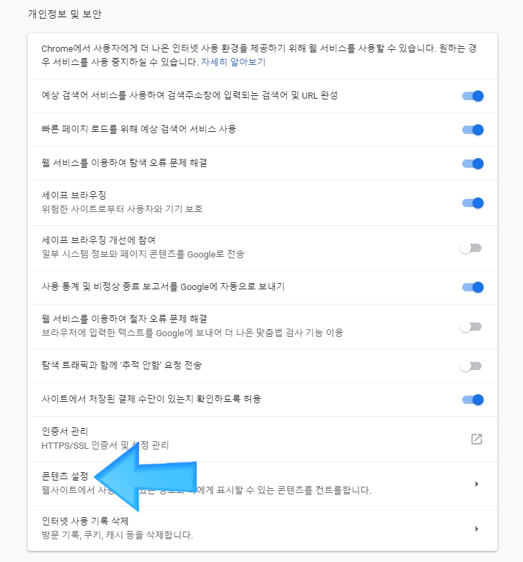여기서 "콘텐츠 설정" 부분이 있는데 이것을 클릭 해 줍니다.