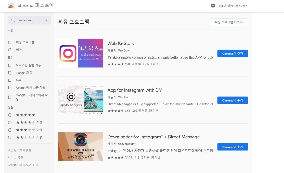 그리고 웹 스토어 검색 창에서 INSTAGRAM 이라고 검색을 해 줍니다.