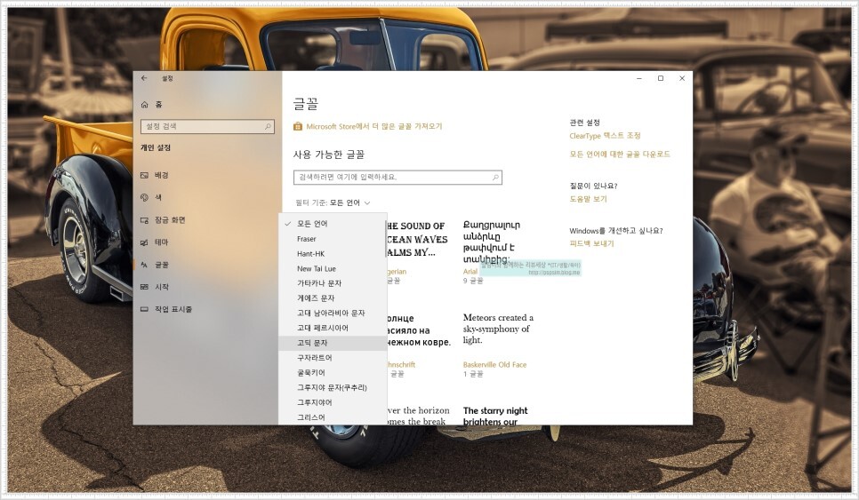 그리고 개인설정 부분에서는 윈도우 글꼴도 변경할 수 있으니 참고하시기 바랍니다.