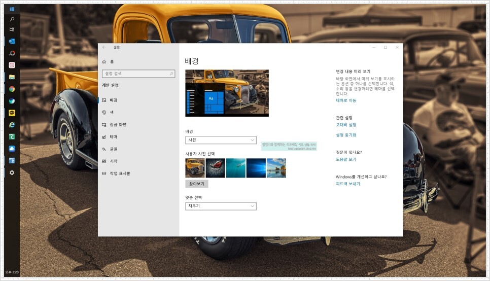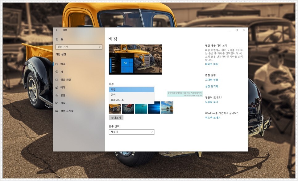 그러면 너무나 쉽게 윈도우 배경화면이 내가 원하는 사진으로 바뀌는 것을 볼 수가 있습니다.