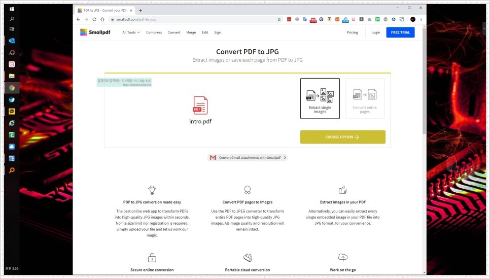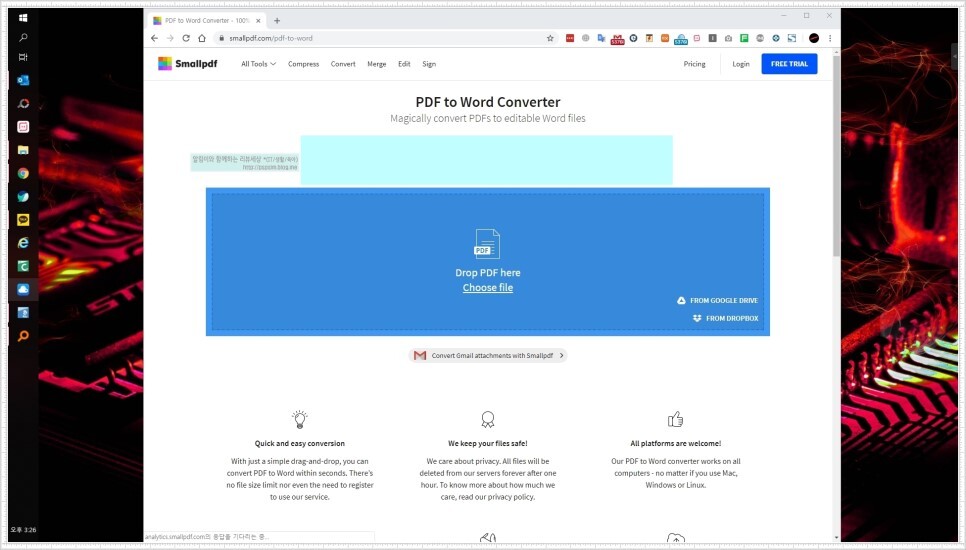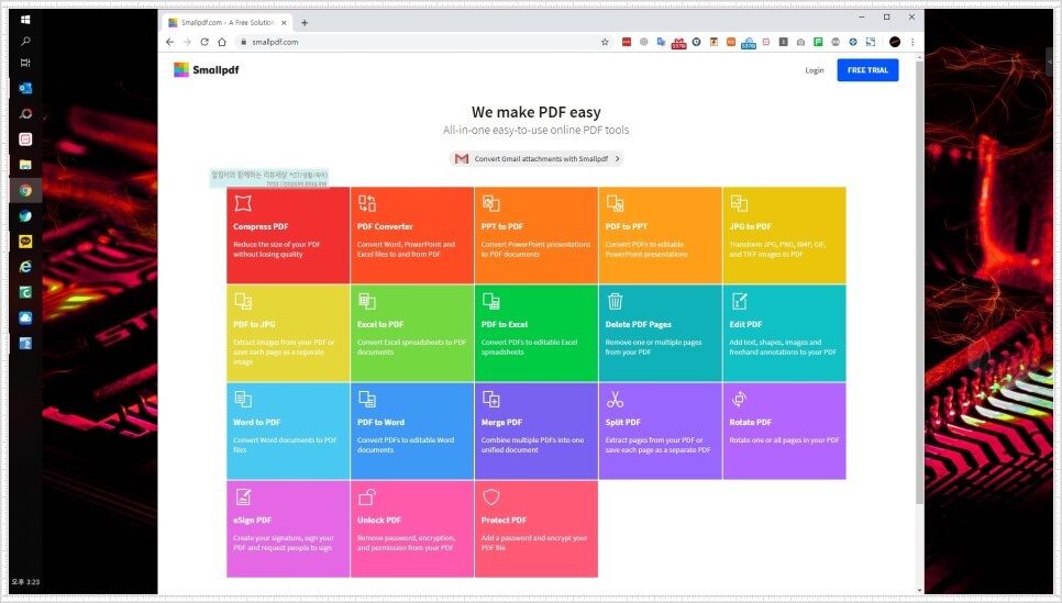 이에 한번의 마우스 드래그 앤 드랍을 통해서 PDF 합치기, 용량줄이기, 워드변환, 엑셀변환, 이미지 파일 변환 드을 한번에 쉽게 하는 방법을 알려드리도록 하겠습니다. 여러가지 방법들이 있는데, 오늘 소개드릴 방법은 small pdf 라는 곳에서 드래그 앤 드랍으로 쉽게 변환할 수가 있습니다.