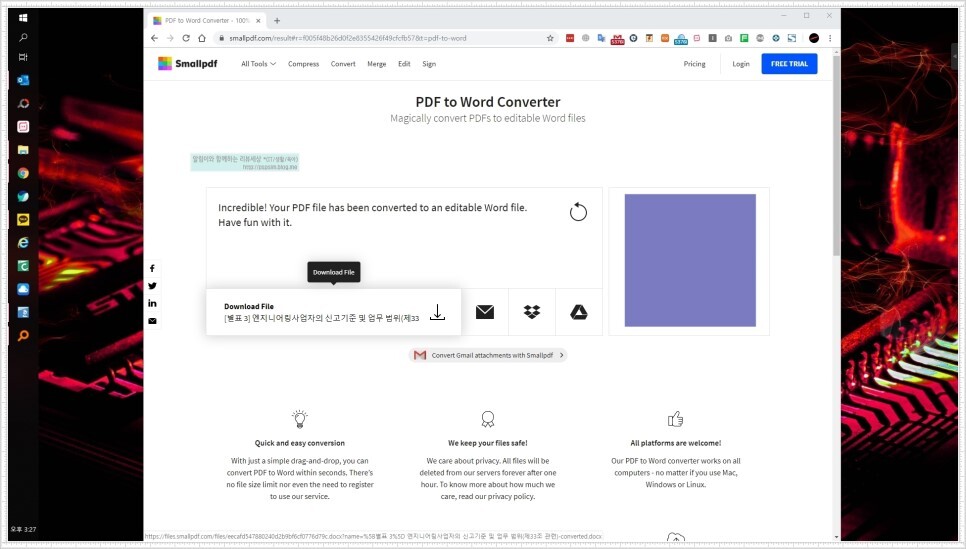 이것도 위에서 하는 방법과 마찬가지입니다. 워드파일로 변환시킬 pdf파일을 파란색 네모난 박스로 옮겨주면 됩니다.