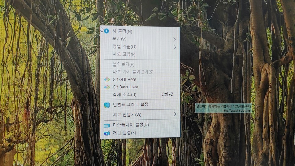 제일 먼저 바탕화면에서 마우스 오른쪽 버튼을 누르면 위와 같은 메뉴가 나옵니다.