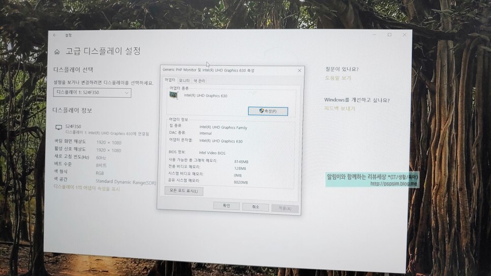 제일 하단에 보시면 "디스플레이 1의 어댑터 속성을 표시"라는 메뉴가 있는데 이걸 눌러줍니다.
