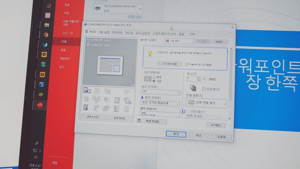 프린터마다 설정이 다르기는 해도 비슷한 용어로 설정이 되어 있기 때문에 쉽게 찾으실 수가 있을 겁니다.
