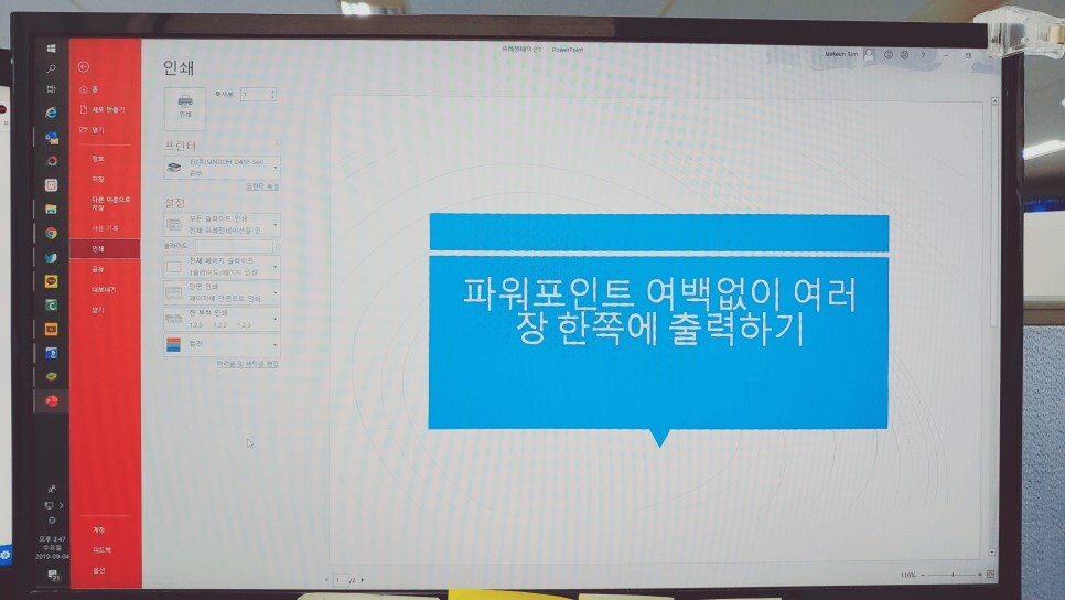 하지만 슬라이드 장수가 너무나 많아서 용지를 절약하고자 한 장에 여러 슬라이드를 모아찍기를 하고 싶을 때가 있습니다.