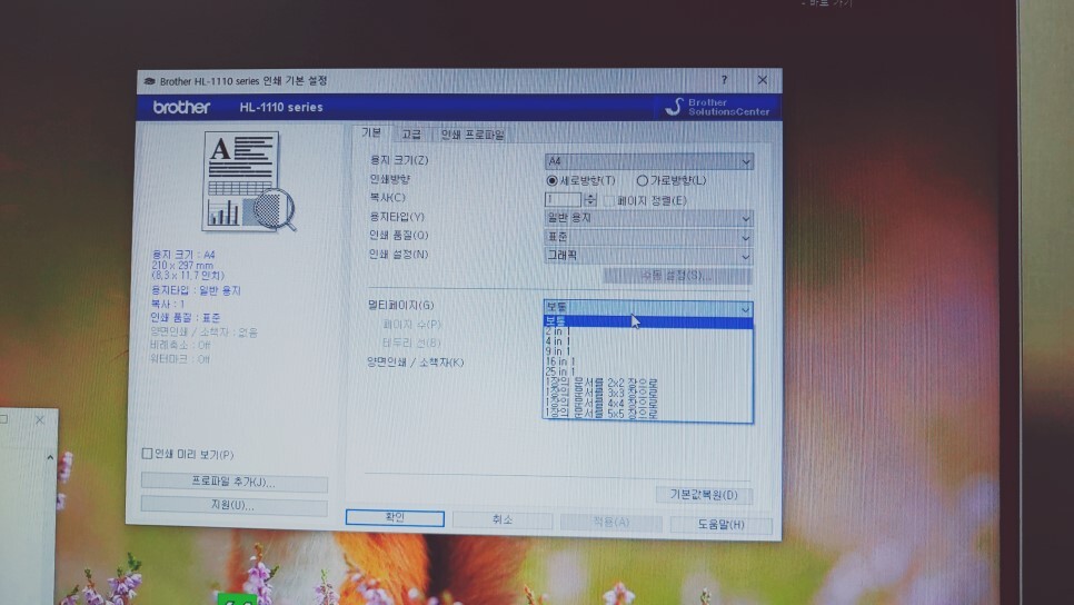 이건 집에 있는 브라더 프린터의 설정 부분입니다. 여기서는 멀티페이지라고 나와있는데 여기서 2 IN 1을 선택해 주면 됩니다.