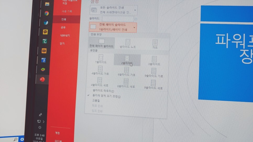 그러면 2슬라이드, 3슬라이드 이런 식으로 한 장에 여러 장을 뽑을 수 있는 설정을 해 줄 수가 있습니다.