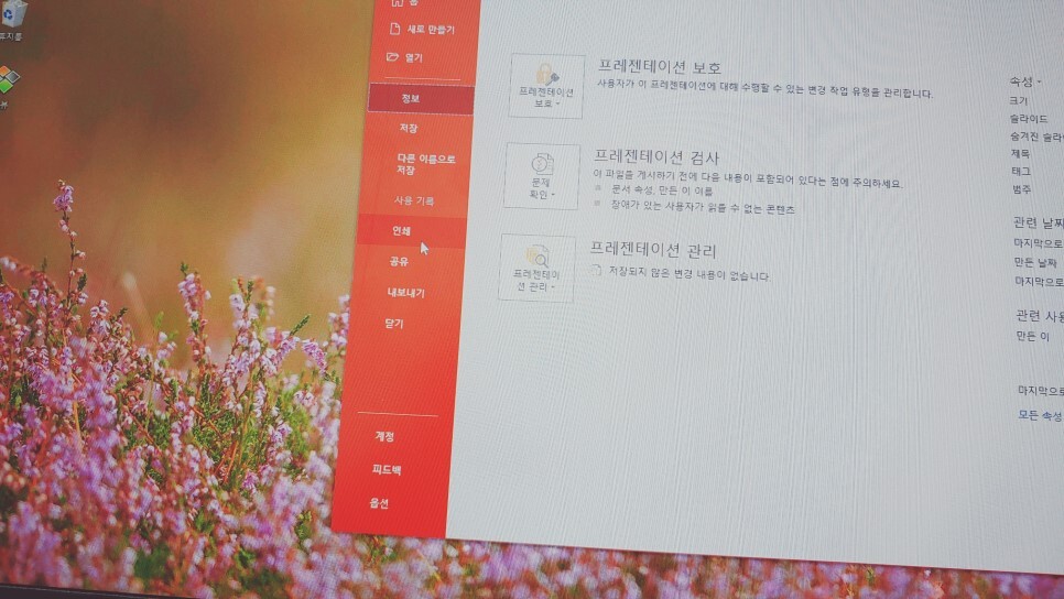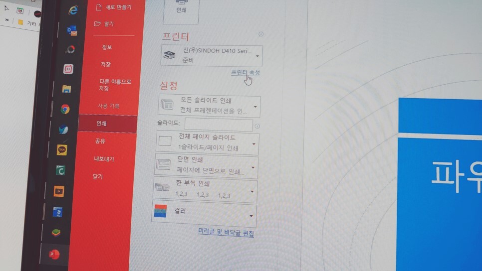 이럴 때는 프린트의 속성에서 조절해 주면 2장의 슬라이드를 A4 한 장에 출력할 때 반쪽씩 꽉 채워서 파워포인트 PPT를 여백 없이 출력할 수 있습니다. 먼저 프린트 속성을 눌러줍니다.