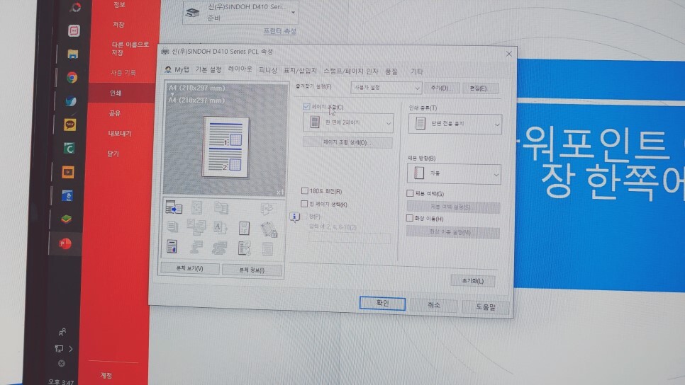 "레이아웃"을 눌러주고 "페이지 조합" 이라는 옵션을 체크해 주면 "한 면에 2페이지"라는 설정을 볼 수가 있습니다.
