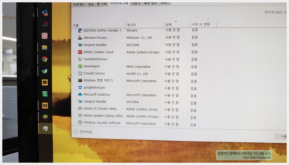 그러면 시작프로그램으로 등록된 프로그램 목록들을 볼 수가 있으실 텐데요.